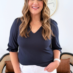 The not so basic basic. This elbow sleeve tee comes with a little wink at the cuff thanks to a notch detail that gives everyday styling a playful edge. Mini rib texture keeps things sleek while the V neck brings just the right amount of polish.