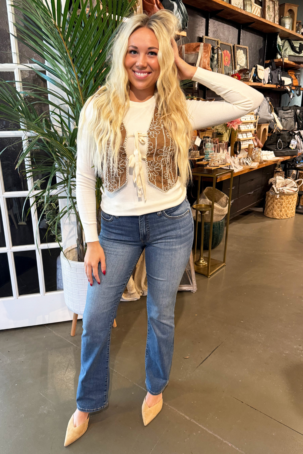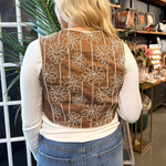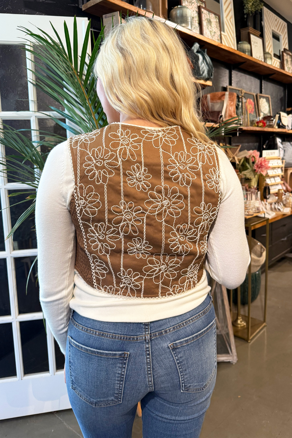 Channel effortless boho charm with this embroidered tie-front vest. Intricate embroidery adds artisanal detail and texture, while the front tie closure lends a relaxed, free-spirited vibe. Lightweight and easy to layer, it’s perfect for pairing over flowy blouses or simple tees. A standout piece that brings a touch of wanderlust to any look!