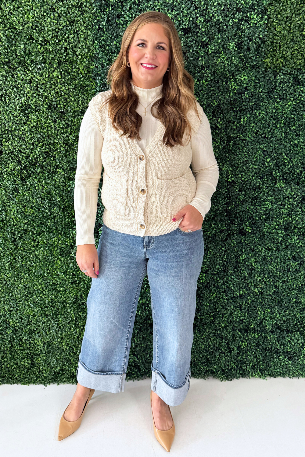 The Emma Cardigan from Thread & Supply is a fall must-have! This sleeveless cardigan has a V neck, button front closure, and front pockets. It is made from soft cotton and is perfect for layering over a basic tee. Add your favorite denim and you are ready for the day!
