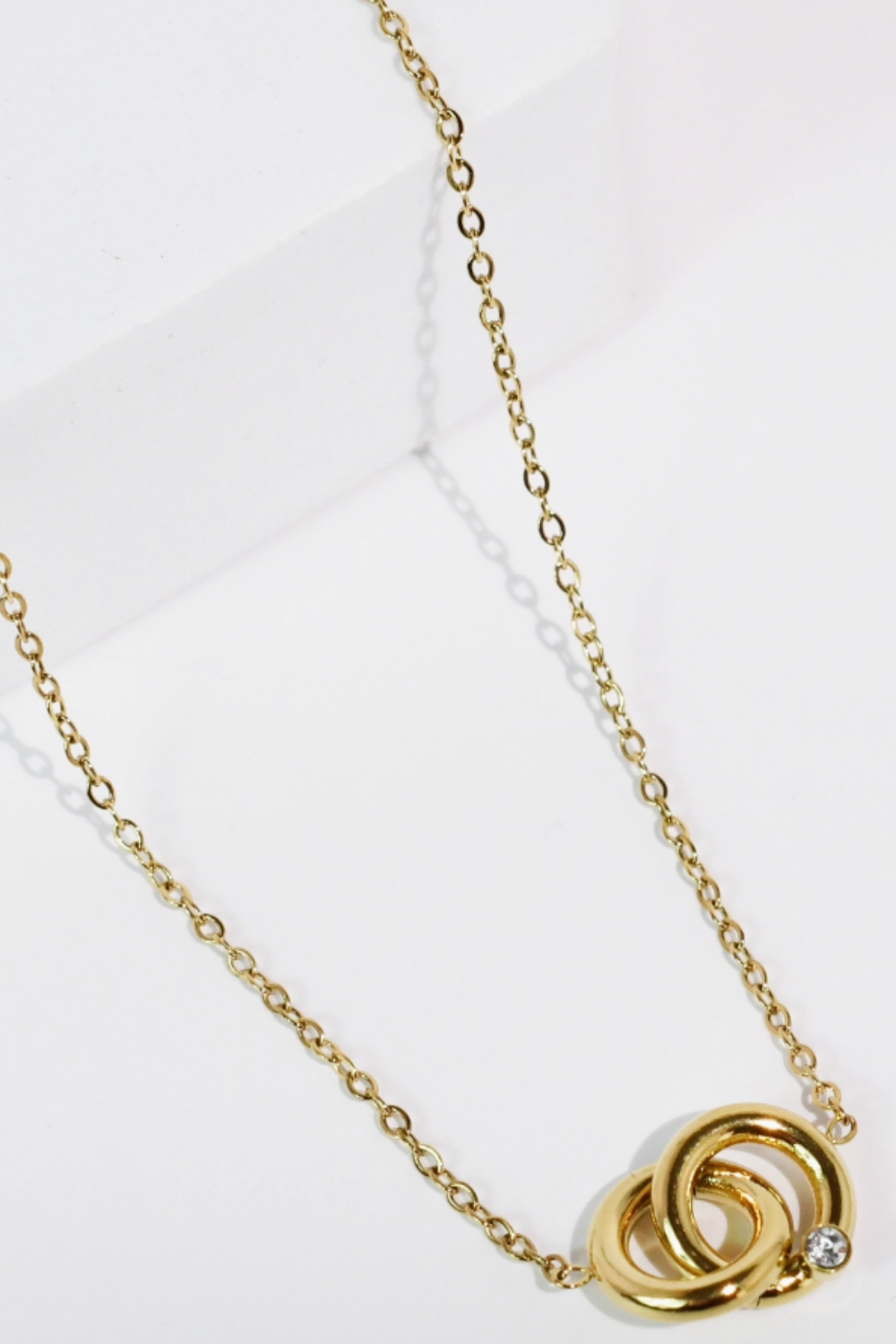 * Delicate, timeless, and full of meaning ✨ This dainty gold necklace features intertwined polished rings, symbolizing connection, unity, and forever moments, finished with a subtle crystal accent for the perfect touch of sparkle. Designed on a fine gold chain, it’s lightweight, elegant, and made to shine from everyday wear to special occasions. * Perfect worn solo for a minimal look or layered with your favorite pieces for that effortlessly chic vibe. A beautiful gift or a meaningful staple you’ll never want to take off 💫 * Stainless steel * 17 inch + 3 inch extender