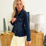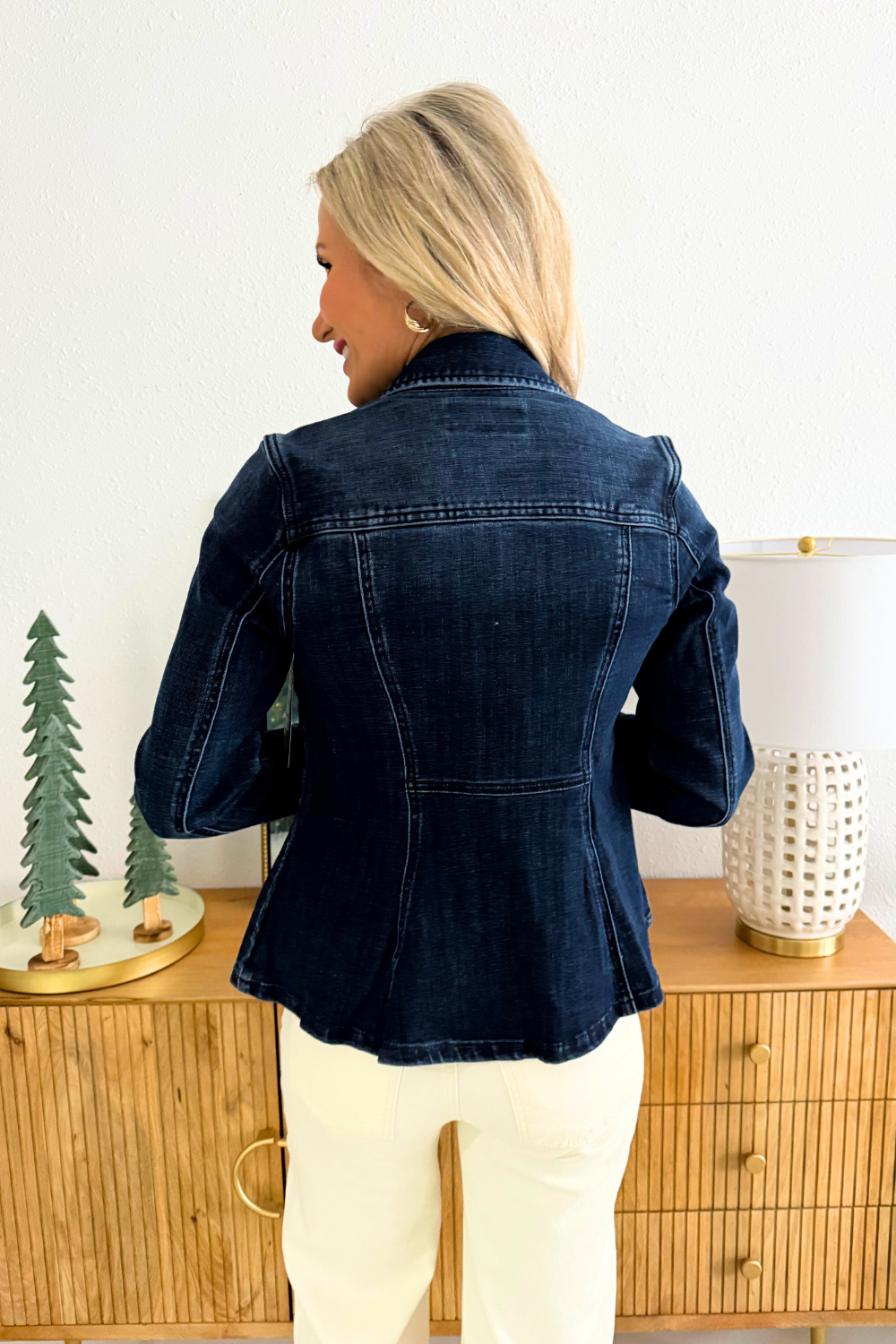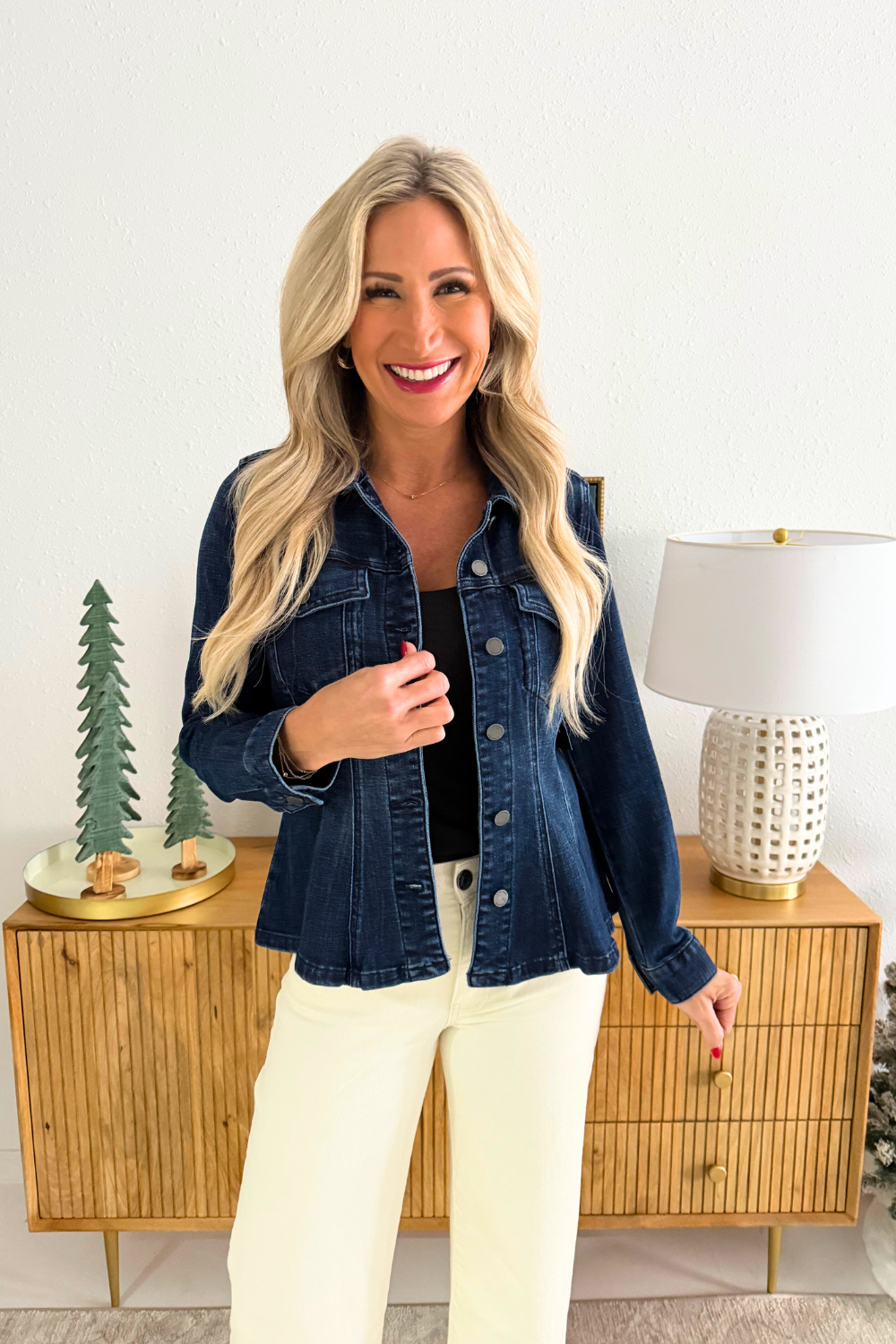 This fit-and-flare denim trucker jacket puts a feminine twist on a classic favorite. Designed with a tailored bodice and a subtly flared hem, it creates a flattering, hourglass shape while keeping the laid-back charm of denim. Perfect for adding a touch of structure and style to any everyday outfit!