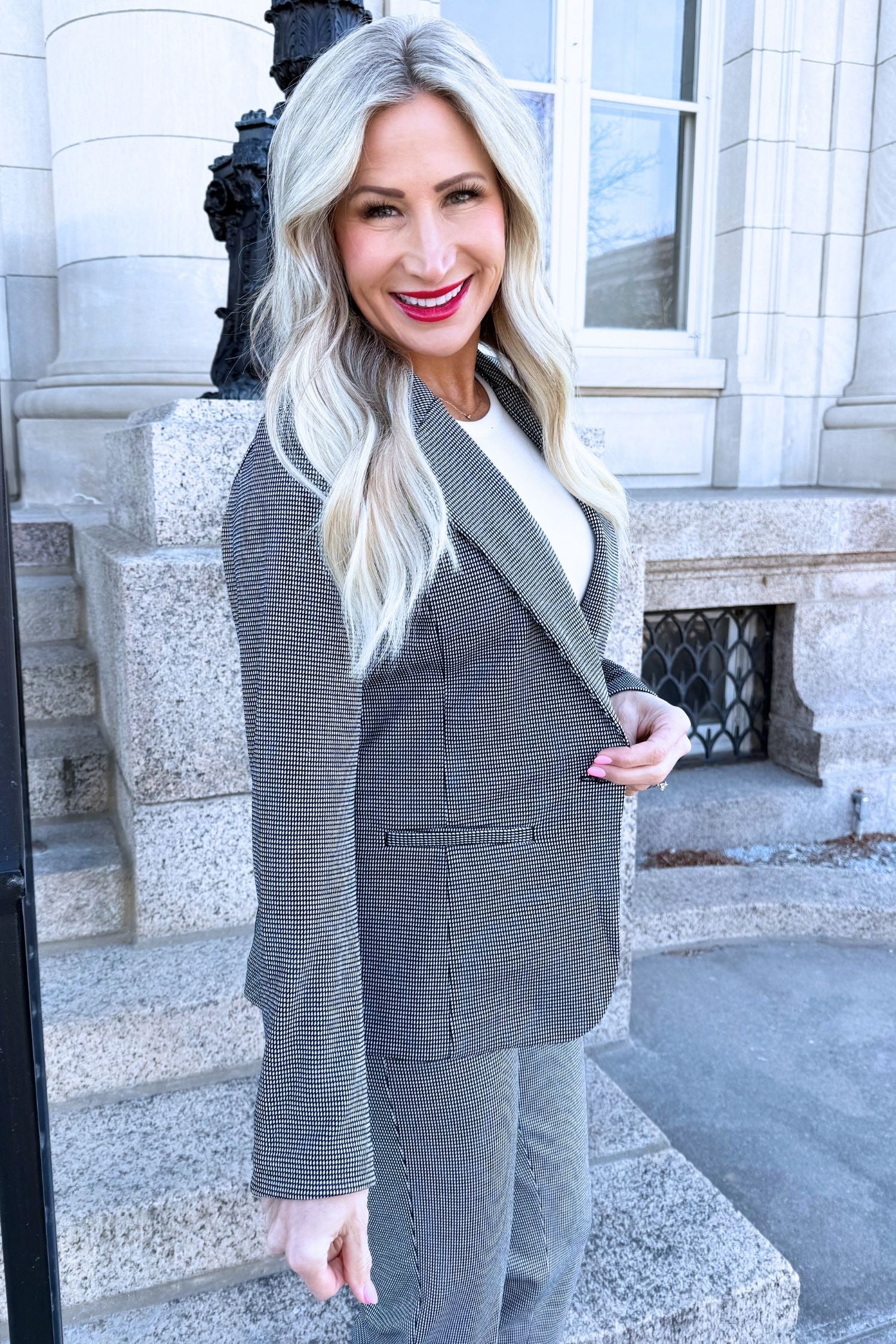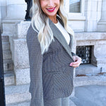 This fitted blazer features a sophisticated Black White Mini Check, making it suitable for any occasion. With its sleek design and versatile style, this blazer is a must-have for any wardrobe. Pair with the matching Kayla Pull-On Trouser for a chic all-in-one look!