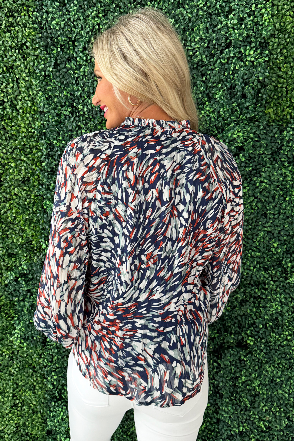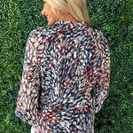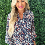 This lightweight woven blouse features a vibrant abstract brushstroke print, smocked cuffs, and a relaxed silhouette for an effortlessly polished and airy look! Pair with your favorite white denim or trouser!