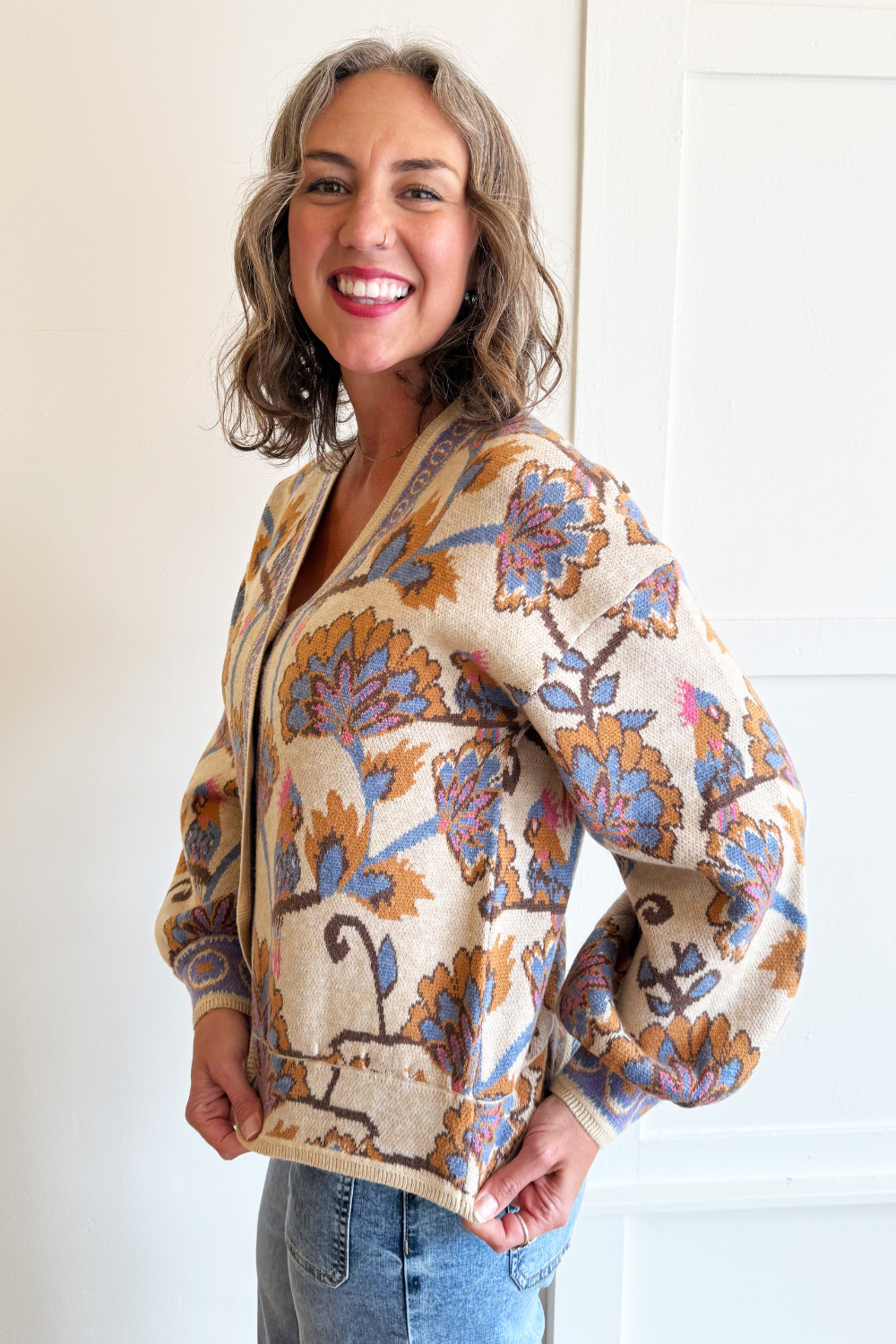 Snag this unique Jacquard Knit V Neck Button Closure Cardigan for a piece that you'll reach for all year! Wear buttoned up on its own or buttoned down layered over a basic!