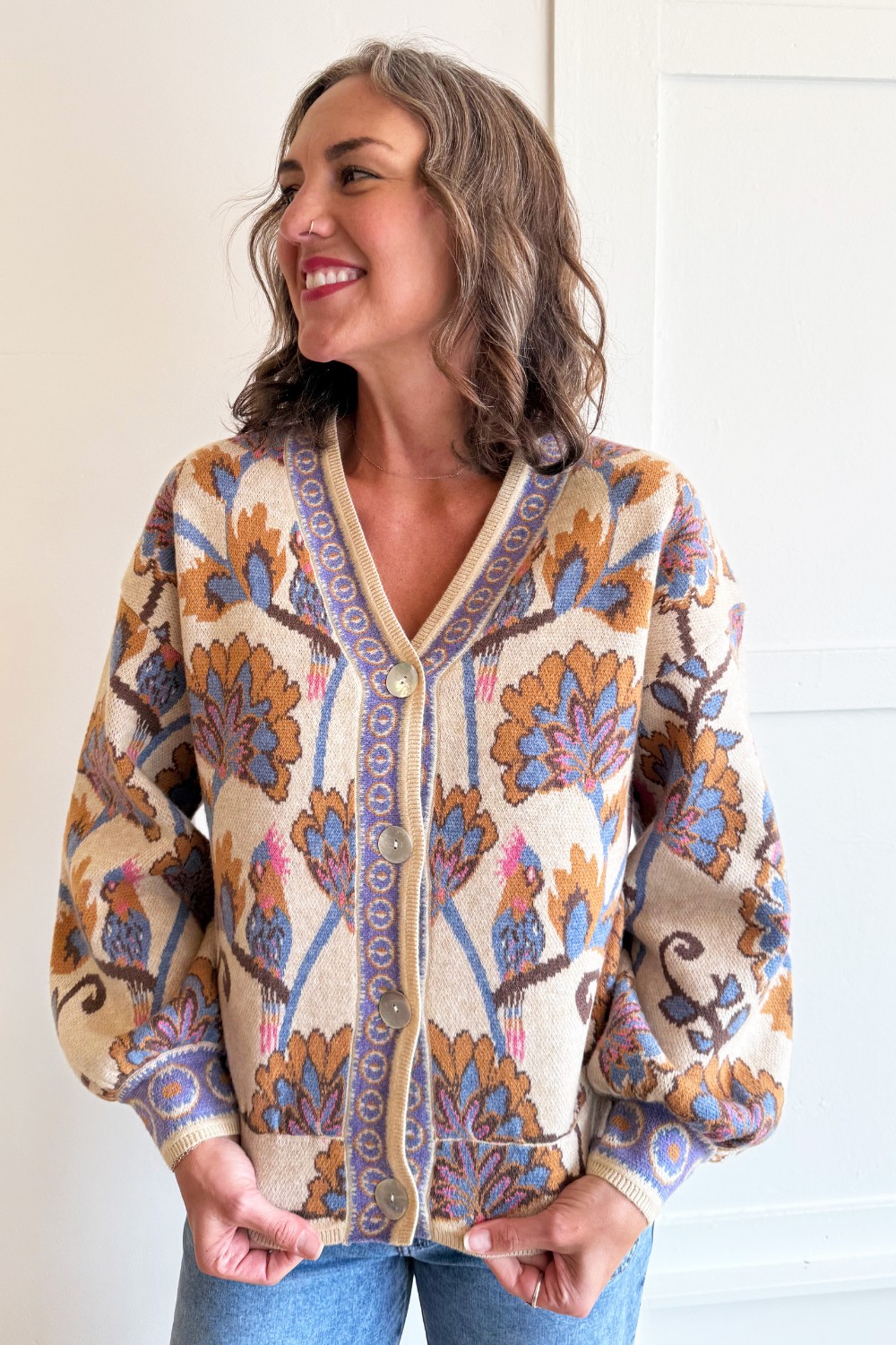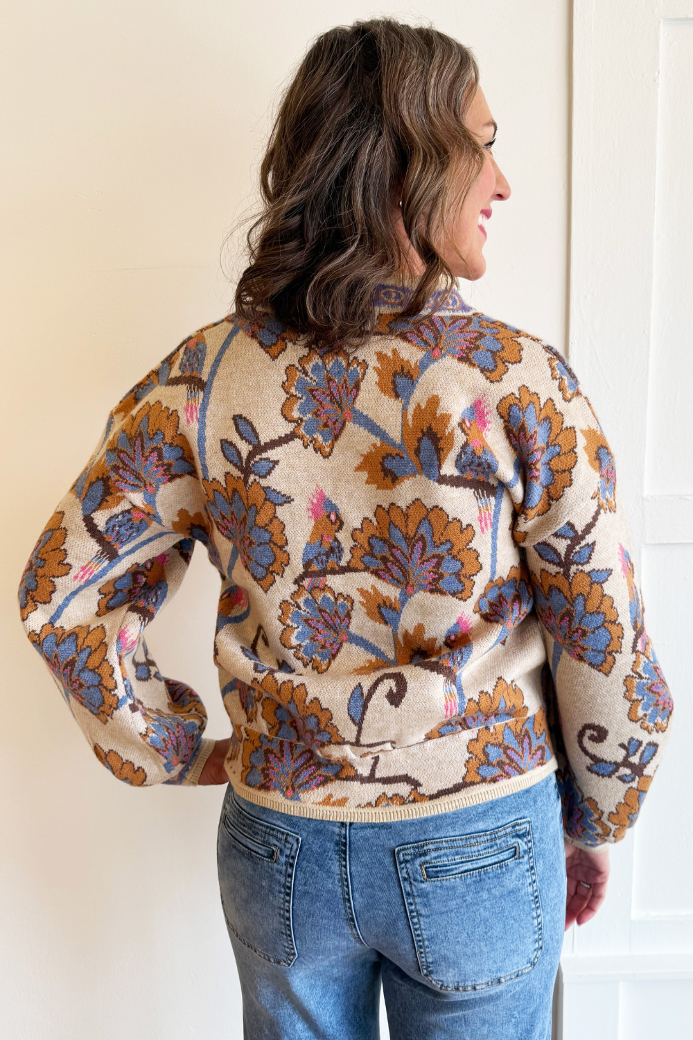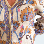 Floral Pattern Jacquard Knit V Neck Button Closure Cardigan