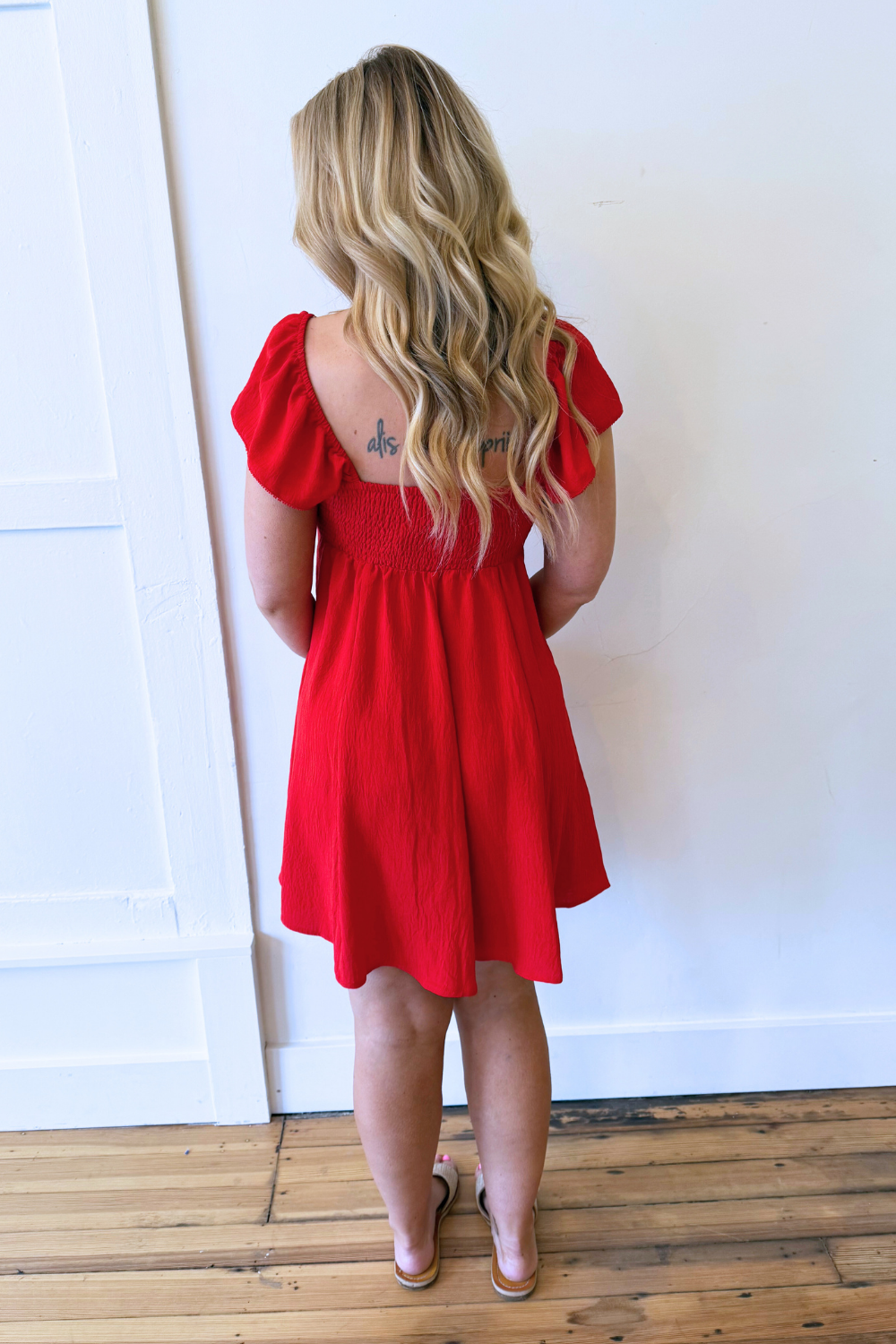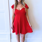 Flutter Cap Sleeve V Neck Dress This red dress features a flattering v-neckline and soft flutter cap sleeves that add a feminine, effortless touch. The lightweight fabric and easy silhouette make it comfortable while still feeling polished, making it perfect for events, date nights, or dressing up with heels. The classic red color makes this a standout piece that can easily transition from day to night.