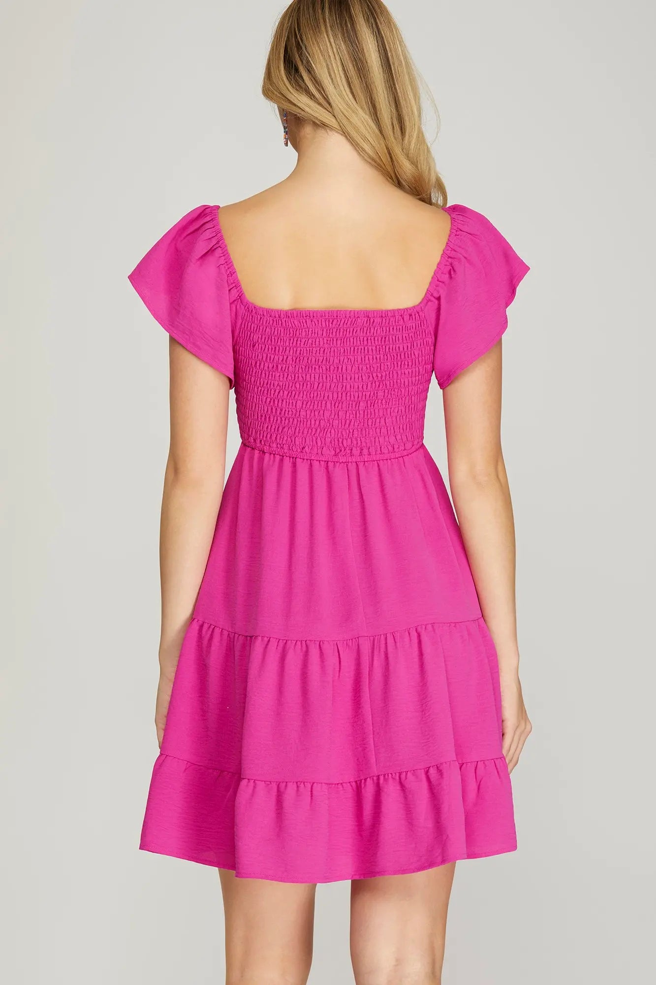 This adorable Flutter Sleeve Smock Tiered Sweetheart Woven Dress is the peerfect mix of feminine, flirty, and fun! With flutter sleeves and a twirly skirt, this dress is perfect for any special occasion. Style with heels and a necklace for the perfect look!