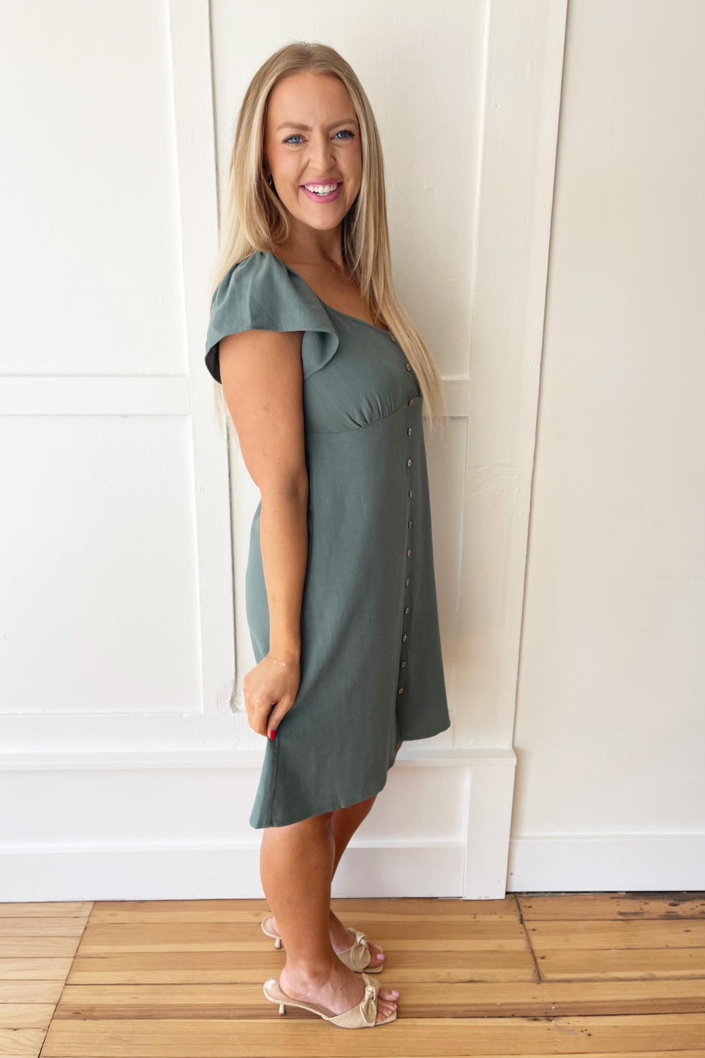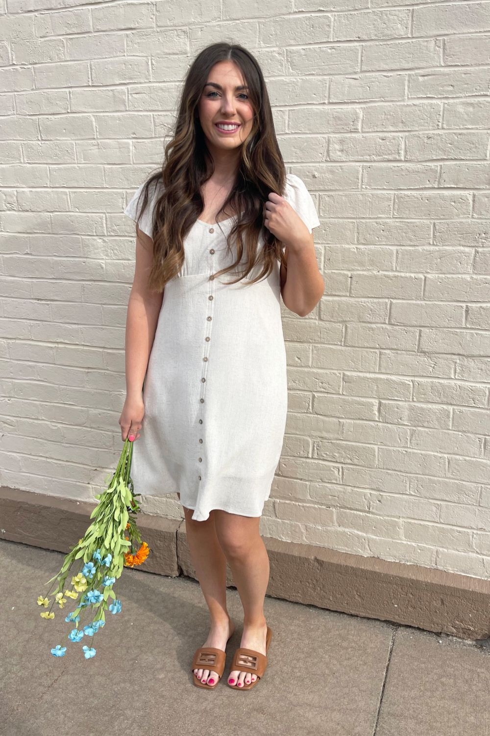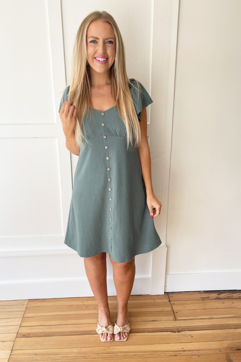 The Flutter Sleeve Square Neck Button Down Dress is must have for your closet. This mini length dress has a square neck, button front, and it is lined. The flutter sleeves add a playful touch to this classic linen dress. Add sandals for a great warm weather look.