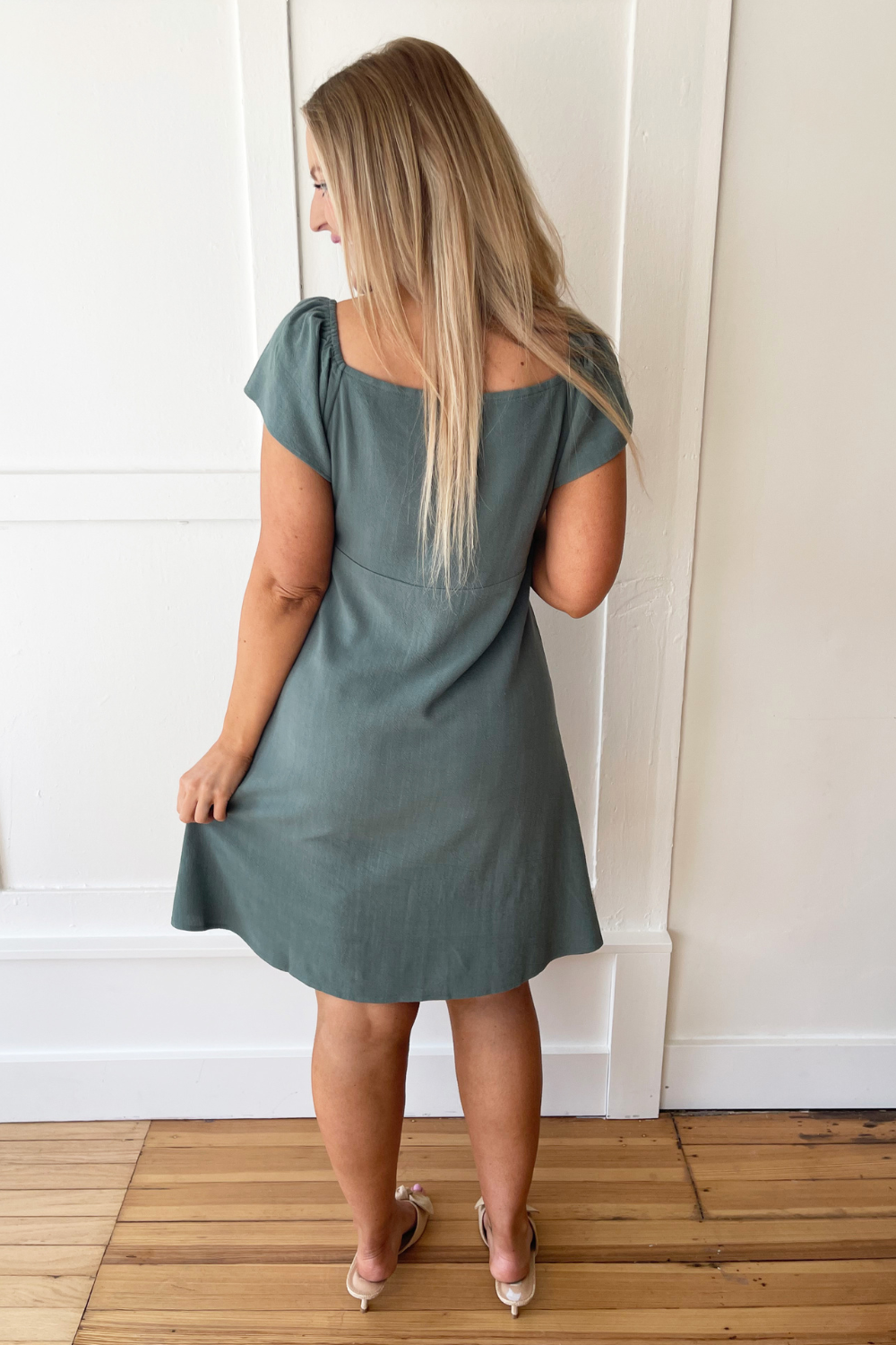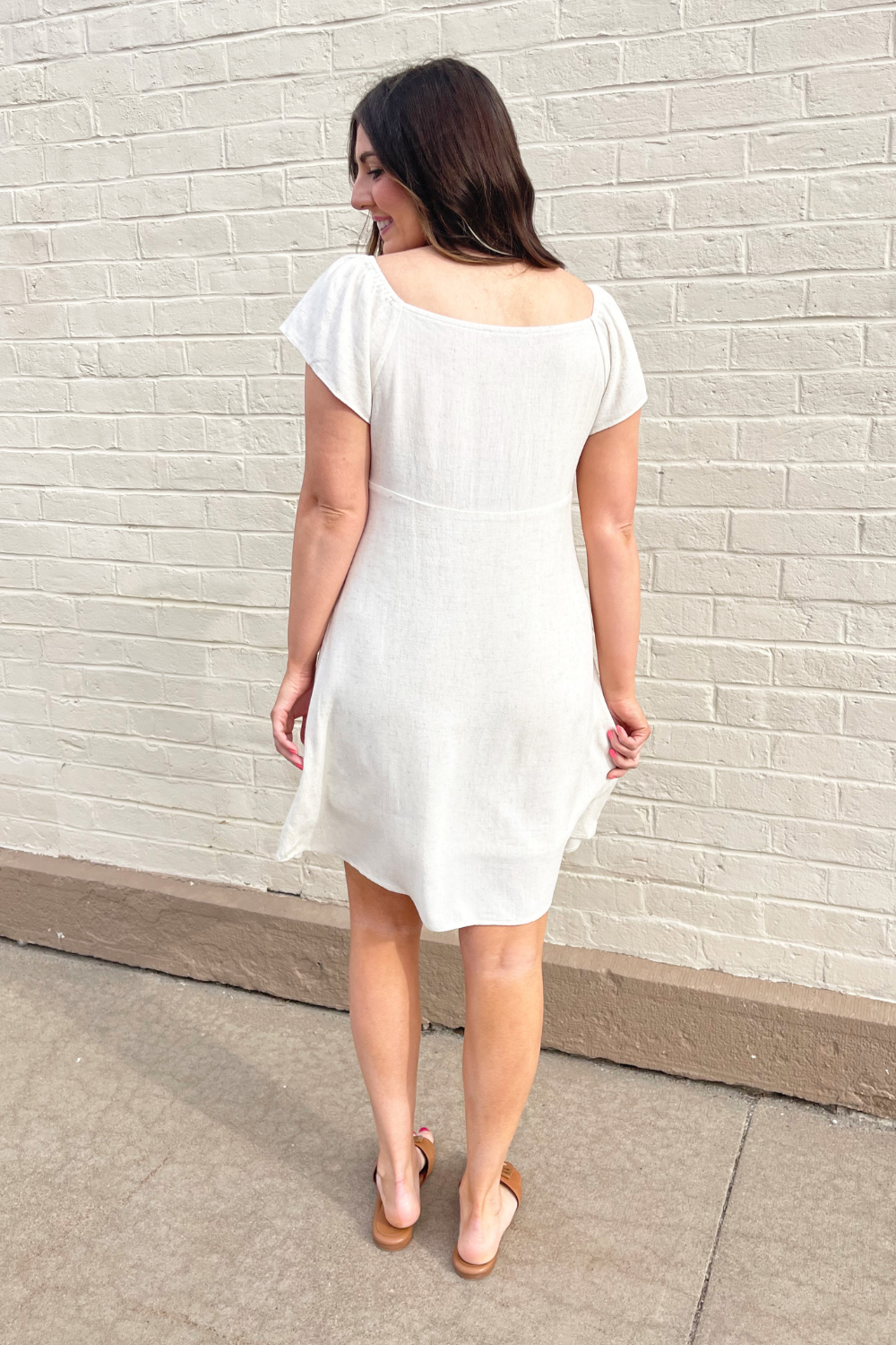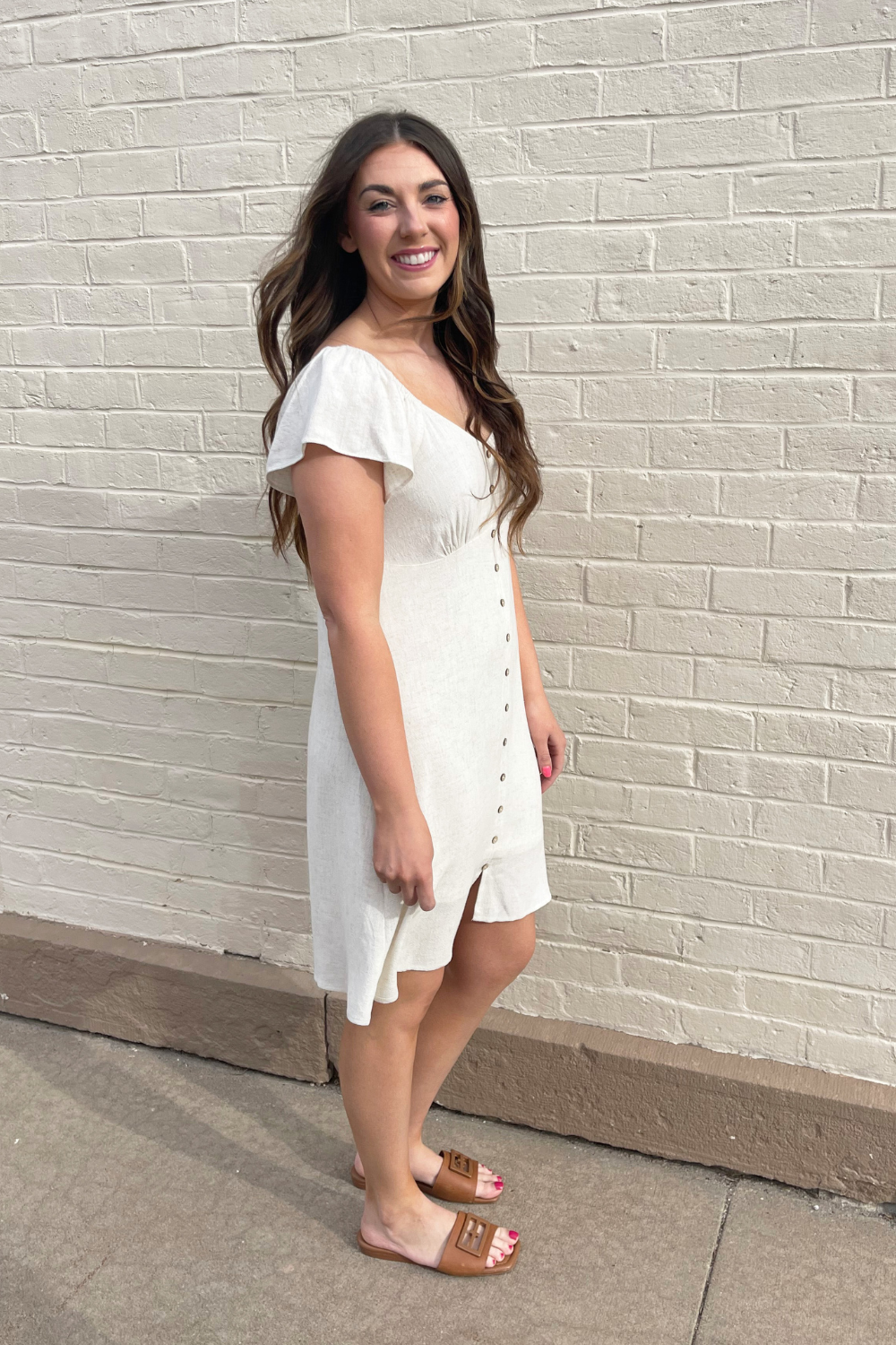 The Flutter Sleeve Square Neck Button Down Dress is must have for your closet. This mini length dress has a square neck, button front, and it is lined. The flutter sleeves add a playful touch to this classic linen dress. Add sandals for a great warm weather look.