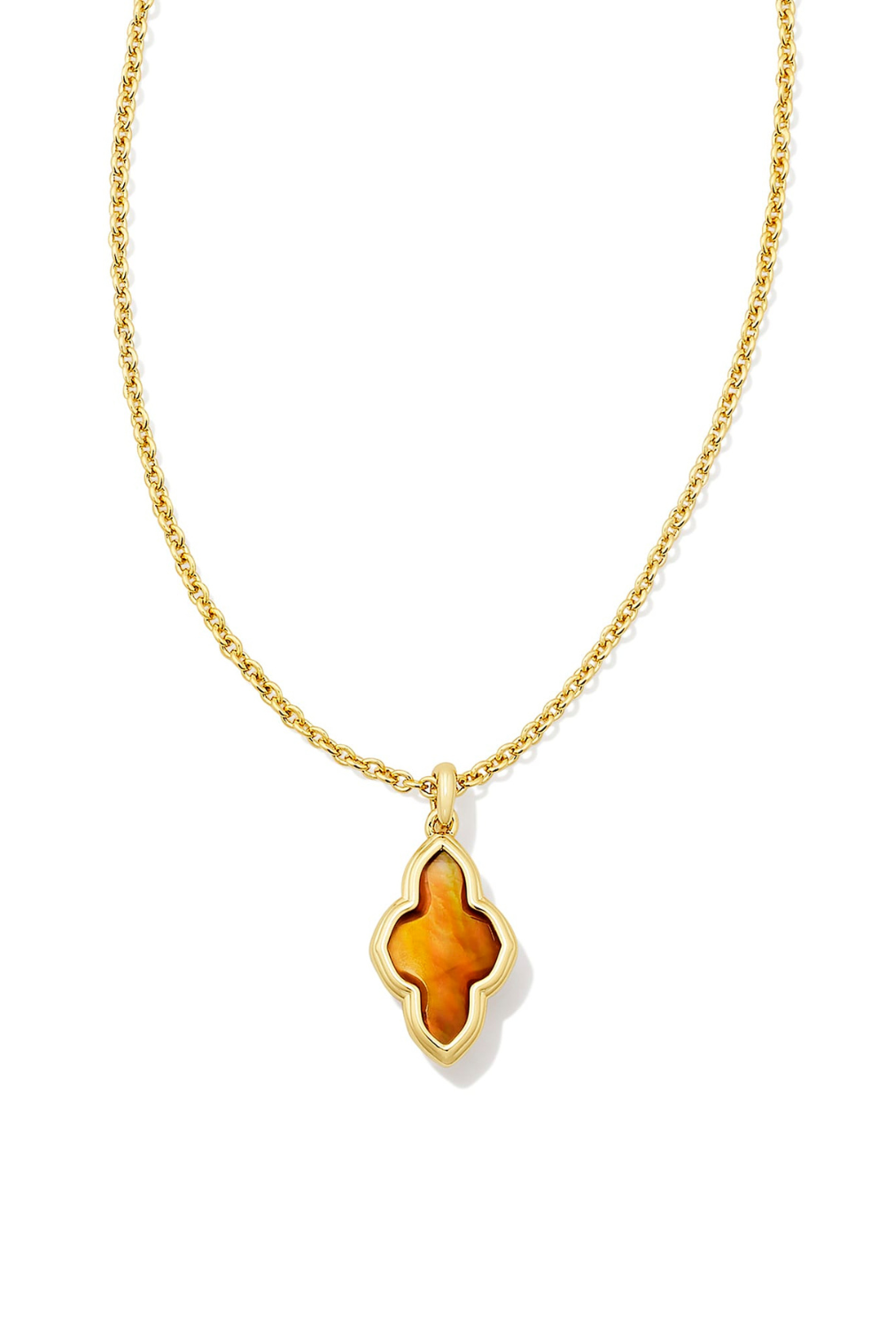 Your favorite shape gets a new metal frame in the Framed Abbie Gold Short Pendant Necklace in Marbled Amber Illusion. Featuring an elongated version of our iconic medallion logo, this pendant makes a sleek addition to your necklace stack.