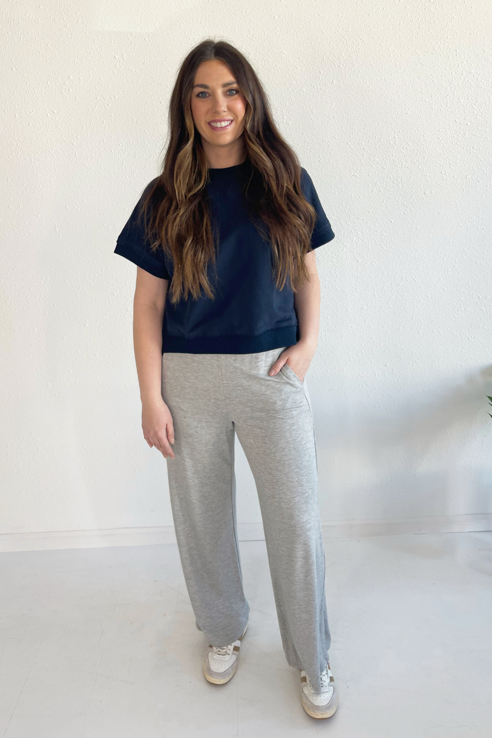 These French Terry Wide Leg Pants are super soft and comfy, you'll want to wear them everywhere. These pants feature a gorgeous flowy fit and a side slit at the hem. Pair them with the Comfort OvalBlend Short Sleeve Crewneck to get Amy's look.