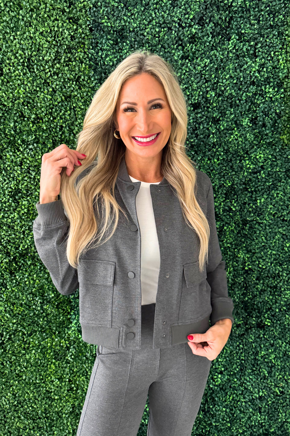 This front pocket bomber jacket blends classic style with everyday ease. Designed with a clean silhouette and functional front pockets, it’s the perfect lightweight layer for effortless, on-the-go outfits. Simple, versatile, and cool. It's an essential staple for any wardrobe!