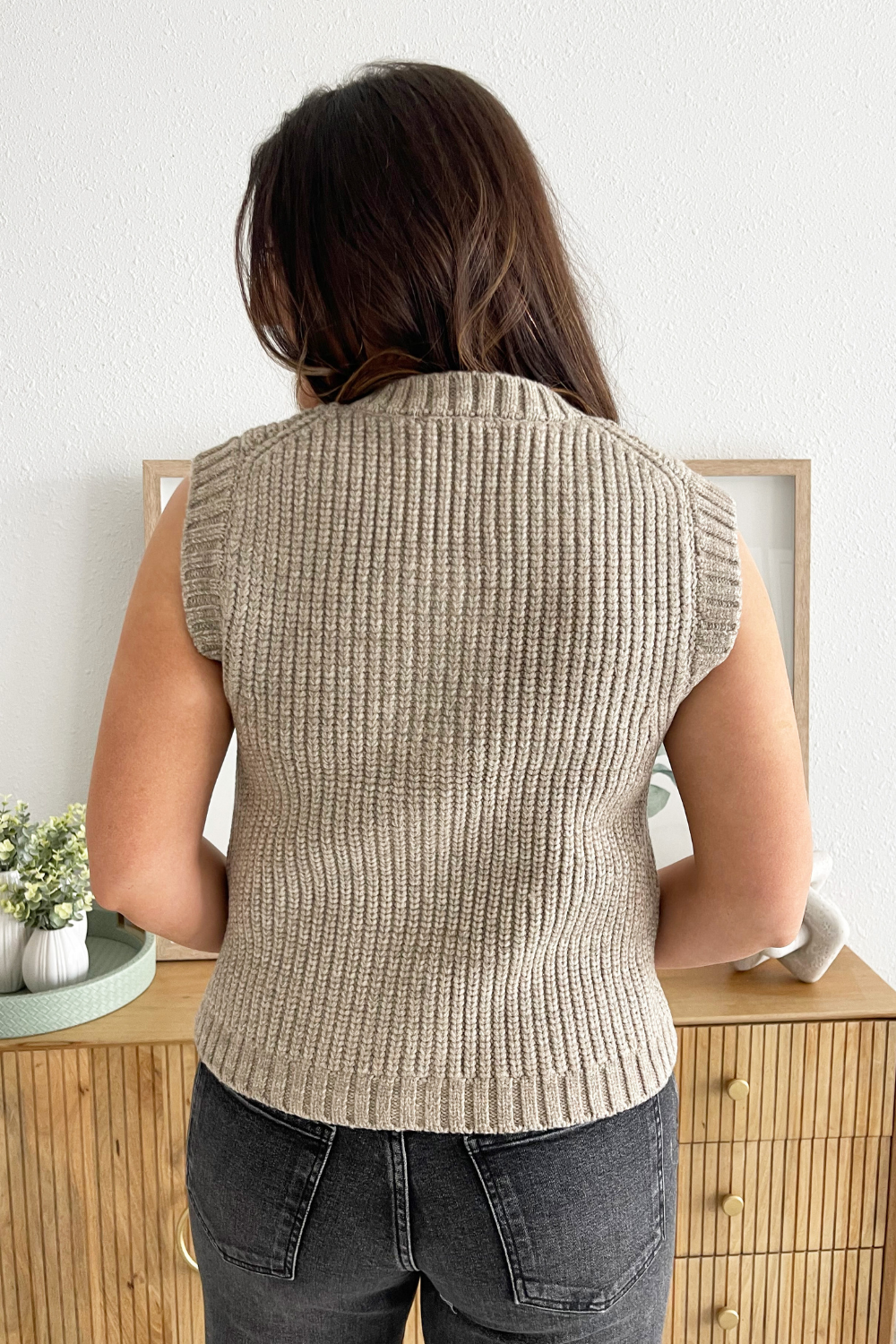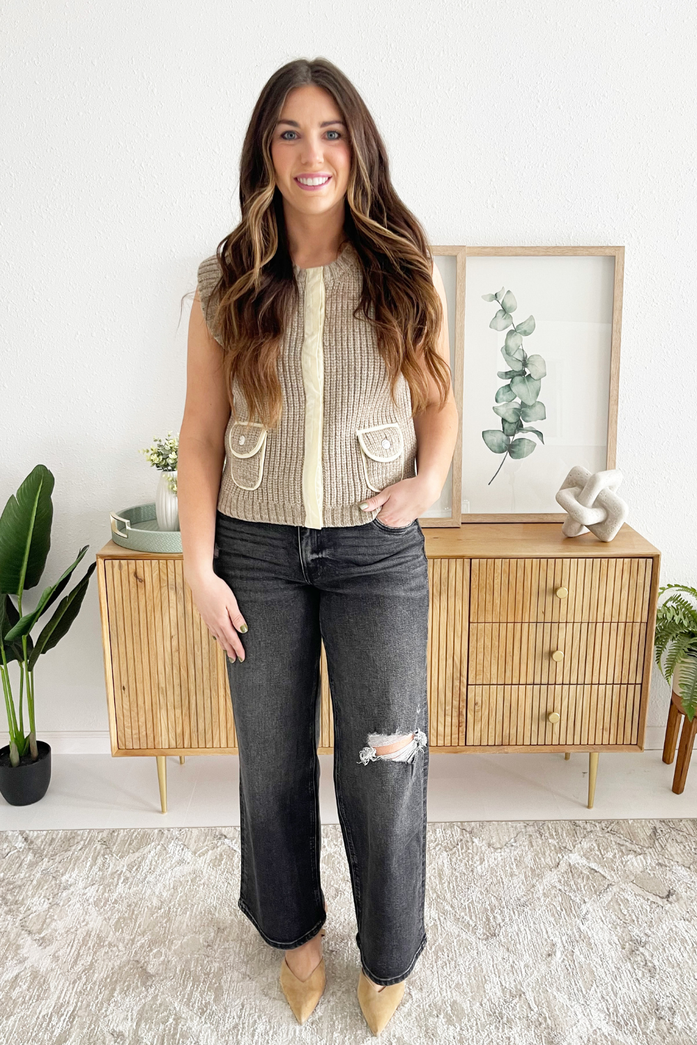 The Front Pocket Crew Neck Sweater Vest will have you ready for warmer weather. This sleeveless vest has a crew neck, contrasting center, and front pockets at the waist. Add your favorite denim or shorts for a fun casual look.