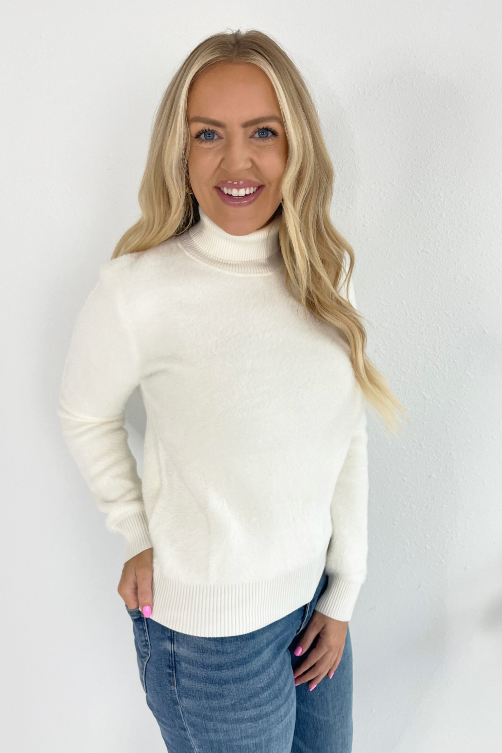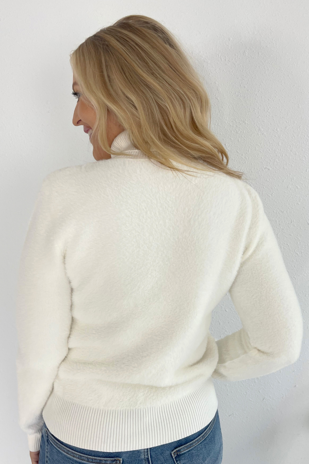 Looking for a great basic sweater? This one is perfect for your fall wardrobe. The Fuzzy Reversible Mock Neck Sweater in cream coordinates with everything in your closet. Plus, it is so soft and cozy for the chilly days ahead!