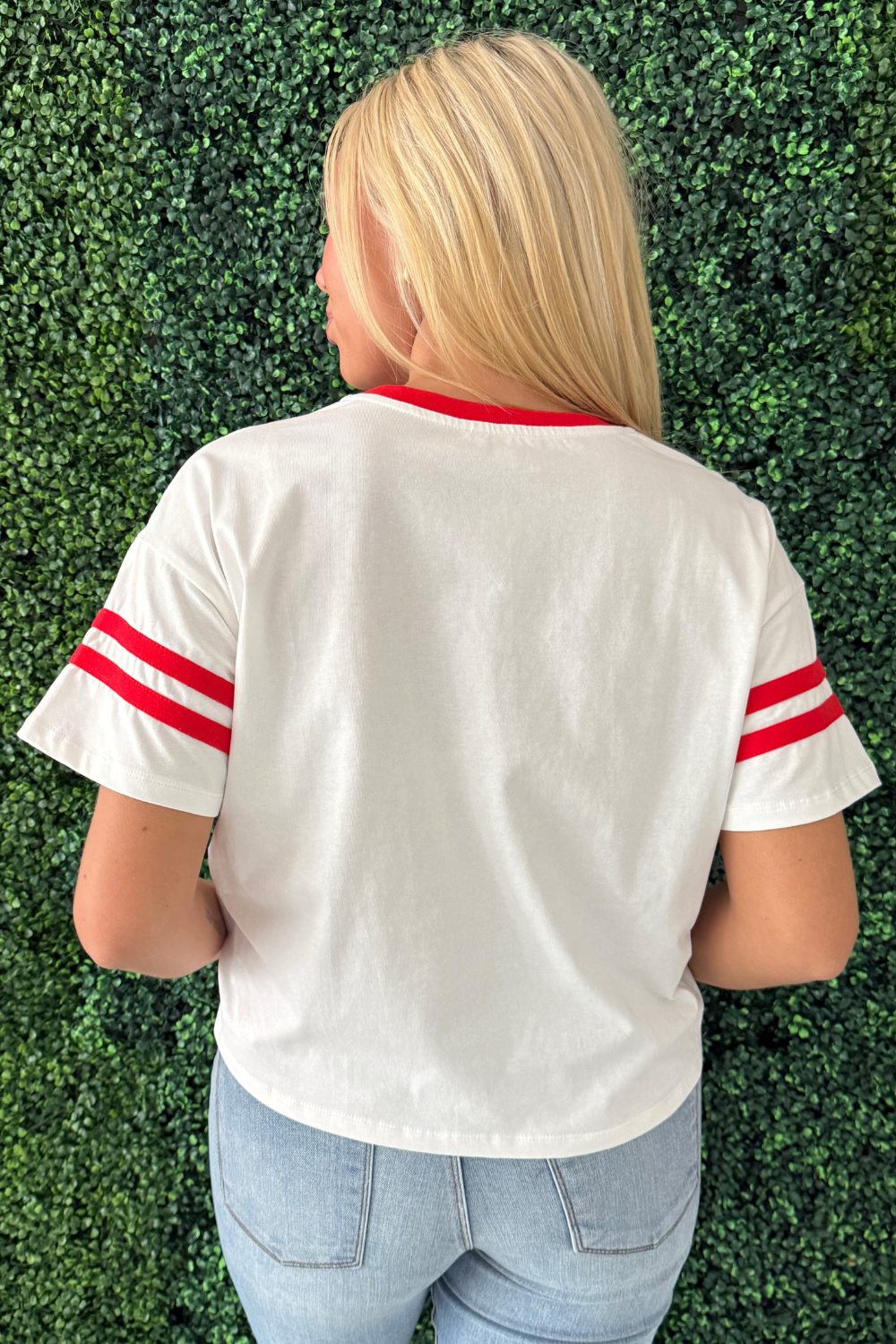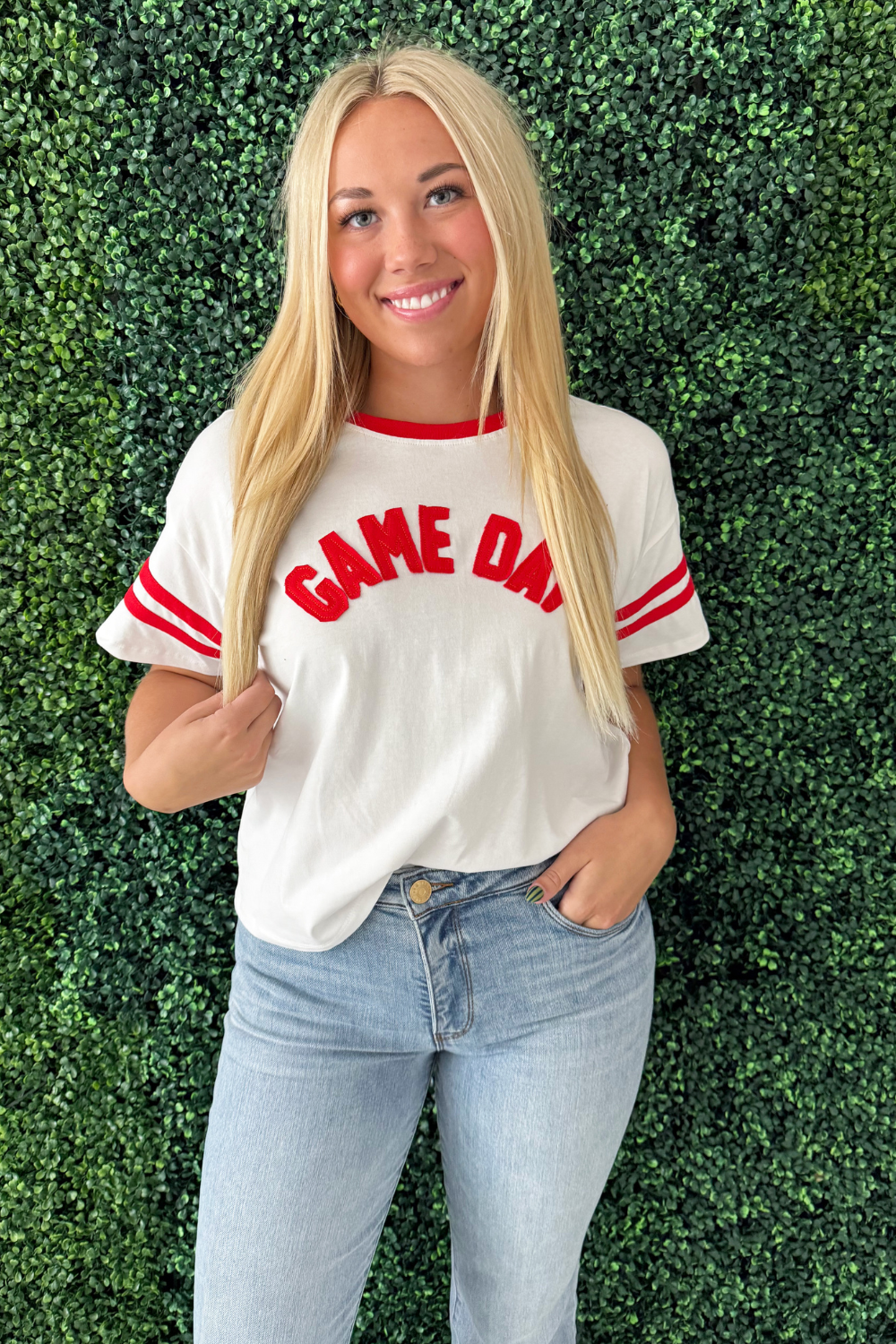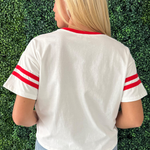 Sporty meets stylish in this game day knit top featuring bold contrast details, a standout collar, and classic sleeve stripes. Soft, comfortable, and full of team spirit, it’s the perfect go-to for cheering in the stands or hosting that weekend watch party!