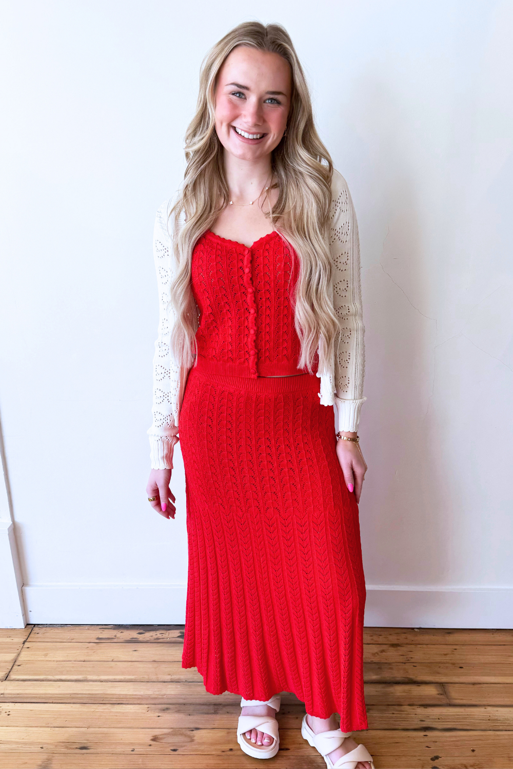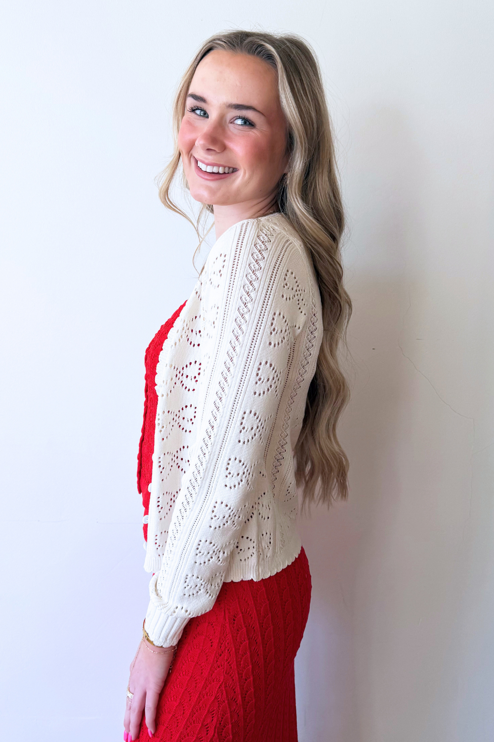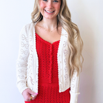 The Gema Cardigan is a beautifully detailed layering piece that adds effortless charm to any outfit. Designed with an intricate open-knit pattern, this cardigan brings texture and interest while remaining lightweight and comfortable. Perfect for layering over dresses or pairing with everyday denim, it’s a versatile staple you’ll reach for year-round. An easy way to elevate both casual and dressy looks.
