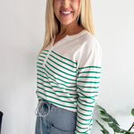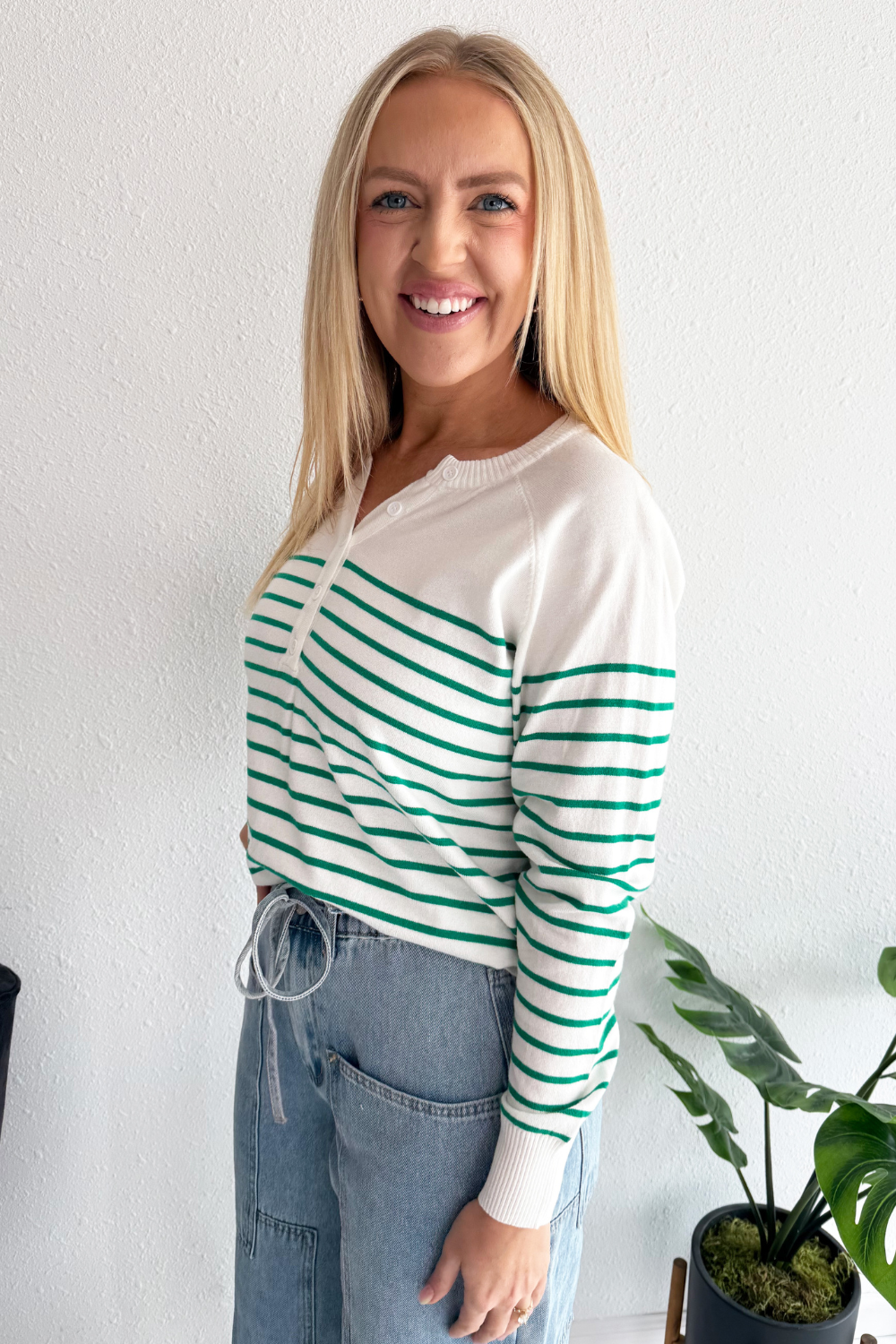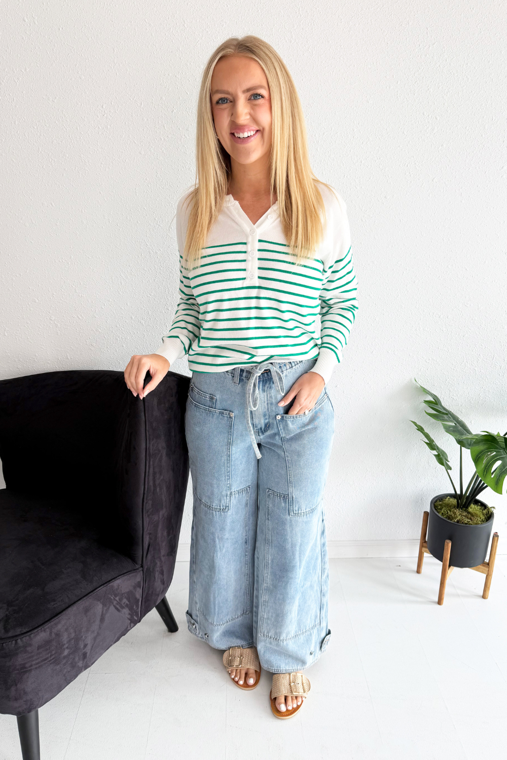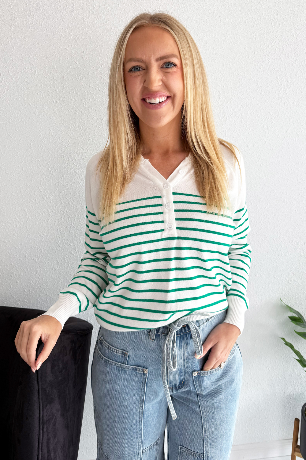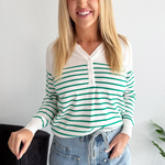 Effortlessly polished, this classic striped long sleeve has a half button detail for a modern touch! The relaxed fit and lightweight fabric make it perfect for layering or wearing solo! Whether tucked into trousers or paired with denim, it adds timeless style with a fresh twist!