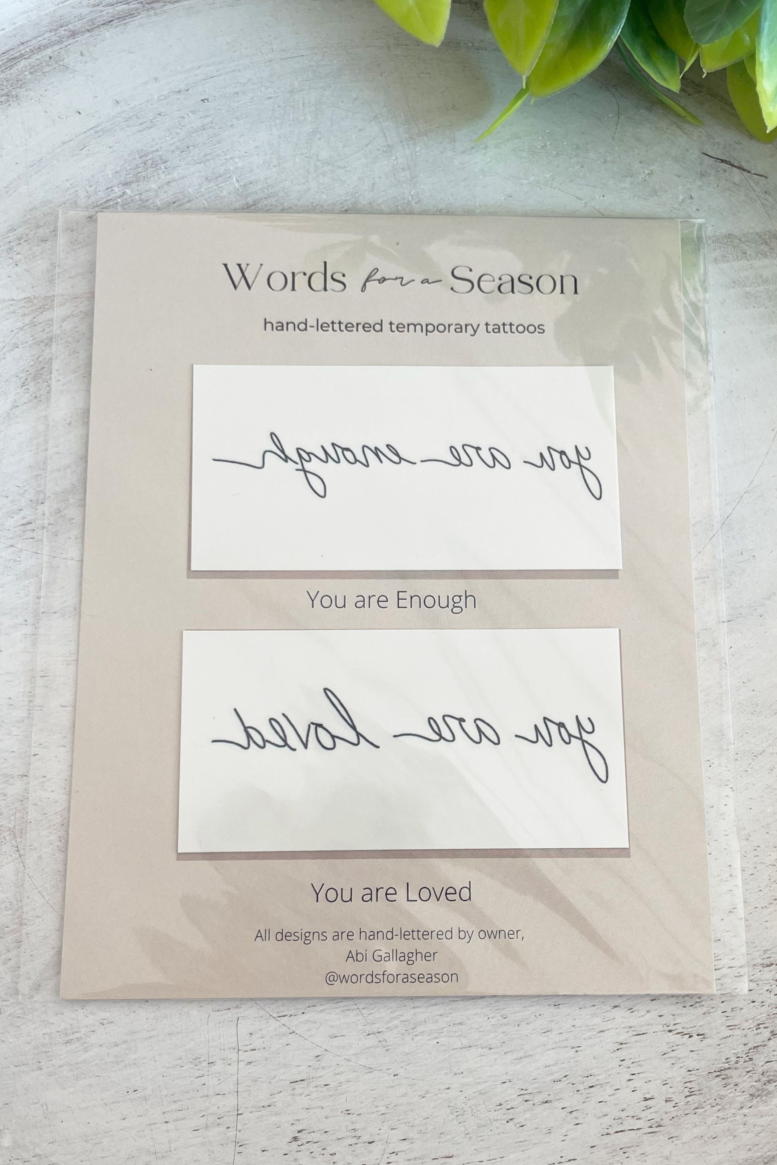 These powerful phrases are the perfect reminder for a mental health boost! These temporary tattoos are hand-drawn by the owner of Words for a Season, Abi Gallagher.