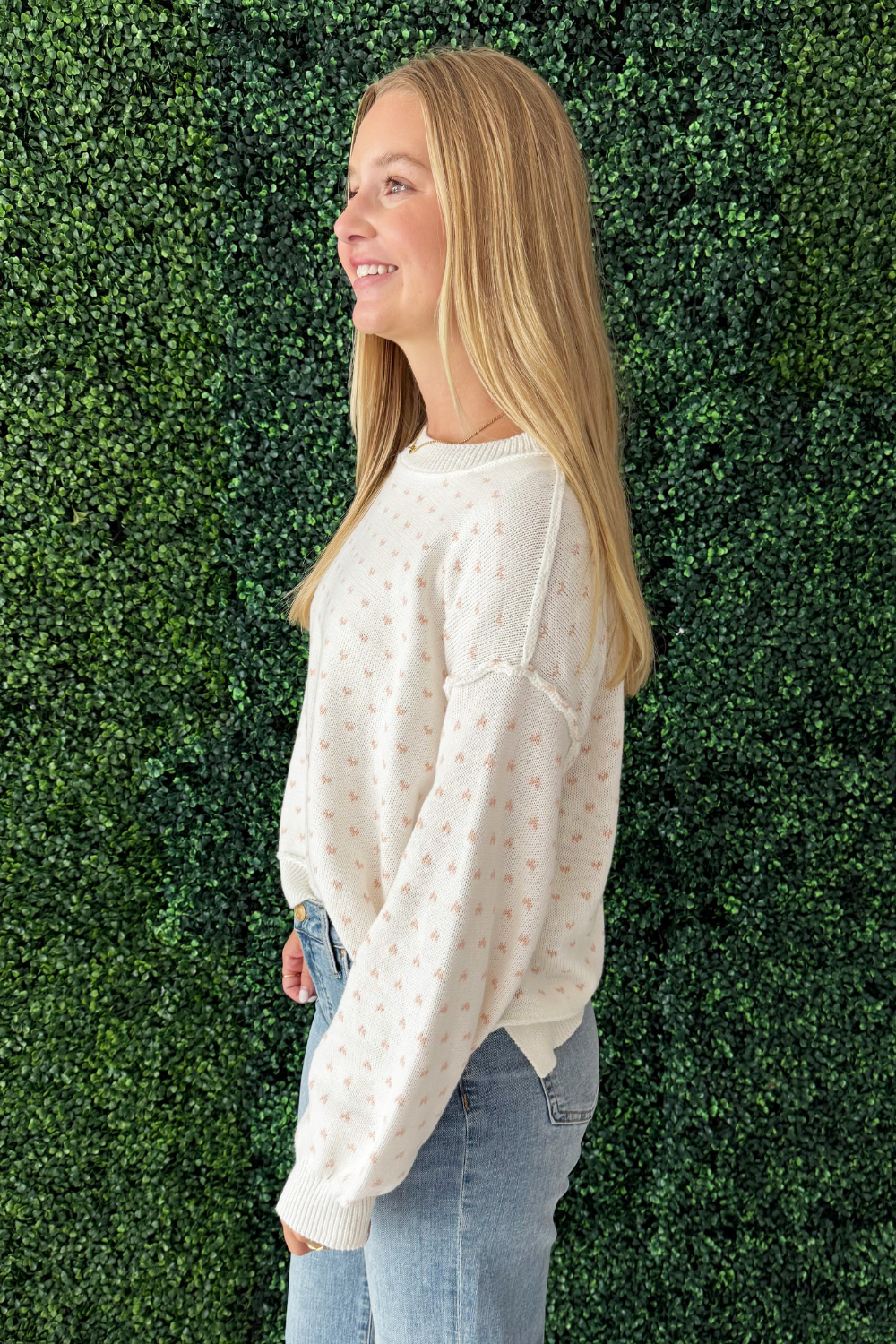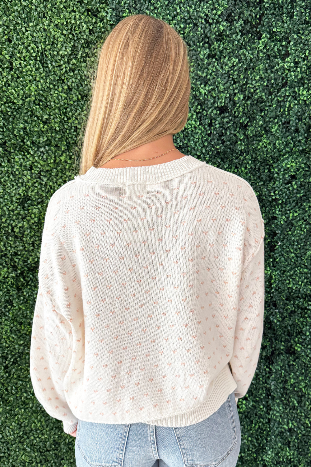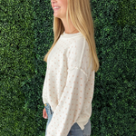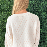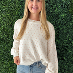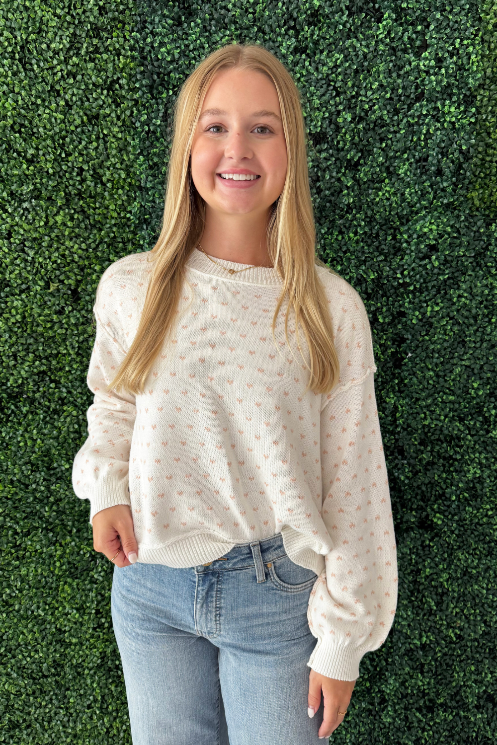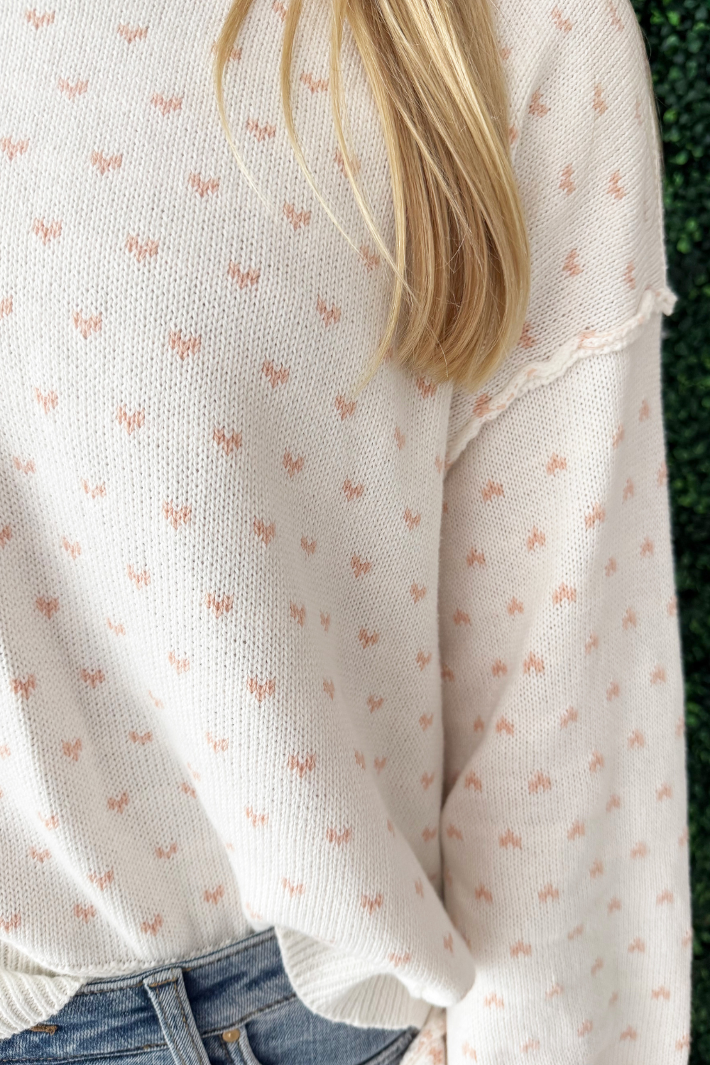 This adorable pullover sweater is perfect for Fall. The Heart Polka Dot Pullover has polka dots allover but instead of dots, they are little hearts! Style with denim or cutoffs, depending on the weather and complete the look with sandals and a cute crossbody bag!