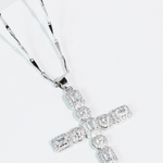 * This timeless cross necklace is designed with clear baguette and round stones framed in delicate crystal detailing for a refined, radiant finish. Set on a sleek silver chain, it offers a classic expression of faith with a modern touch of sparkle. * Perfect for layering or wearing on its own, this piece is both meaningful and effortlessly elegant. * This timeless gold cross necklace is designed with clear baguette and round stones framed in delicate crystal detailing for a refined, radiant finish. Set on a sleek gold chain, it offers a classic expression of faith with a modern touch of sparkle. * Perfect for layering or wearing on its own, this piece is both meaningful and effortlessly elegant.