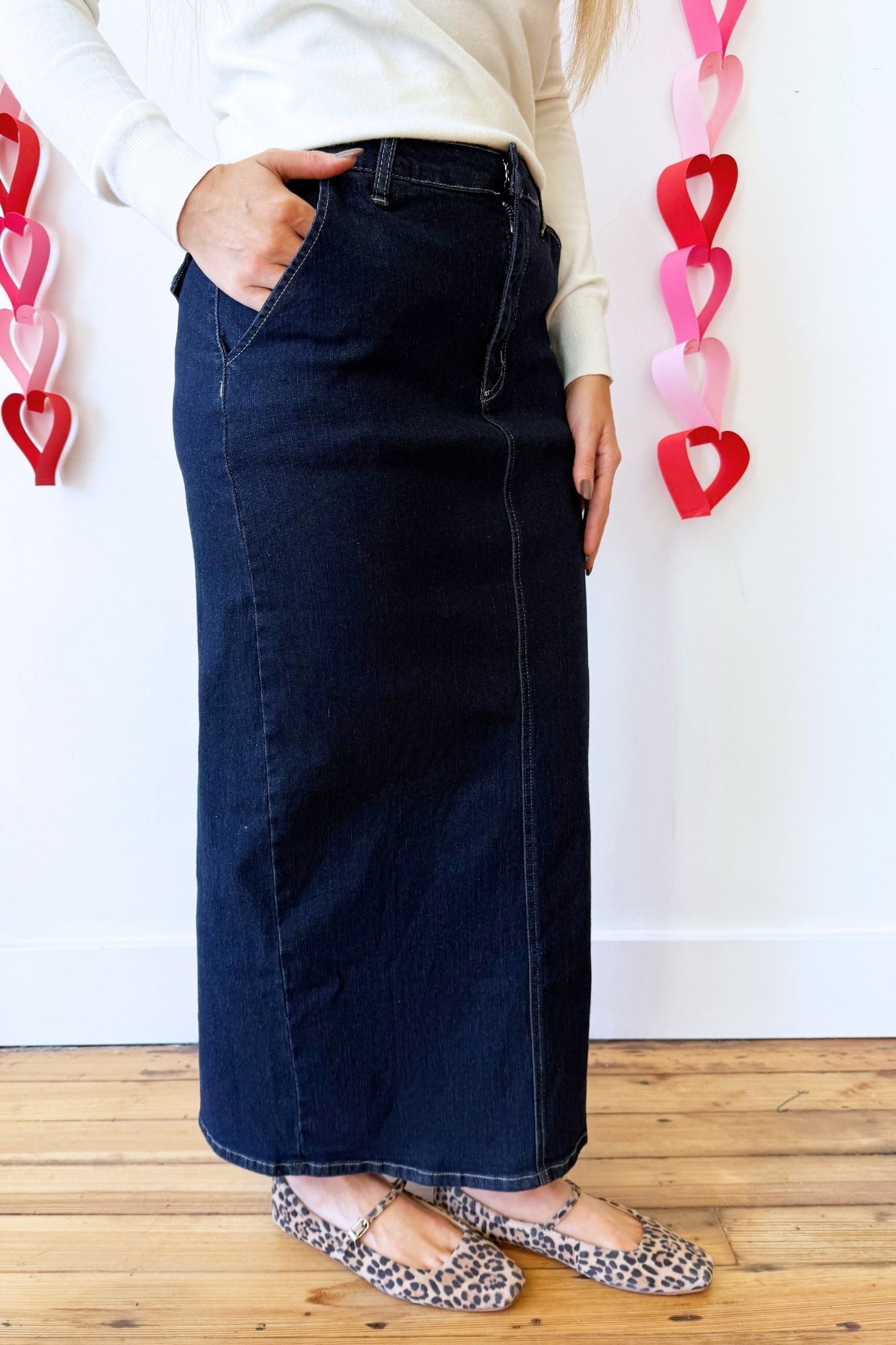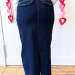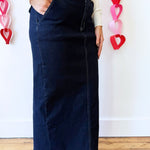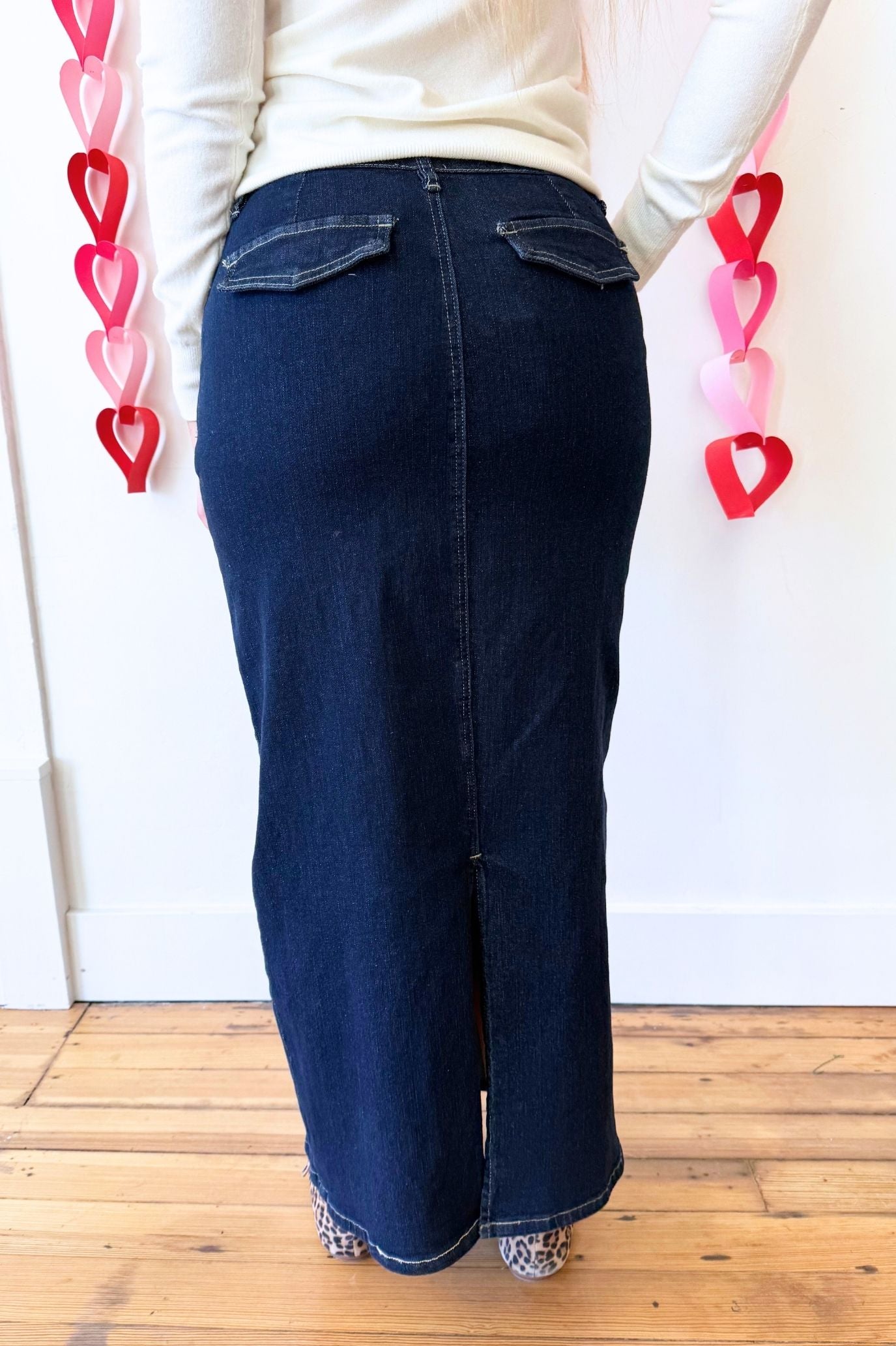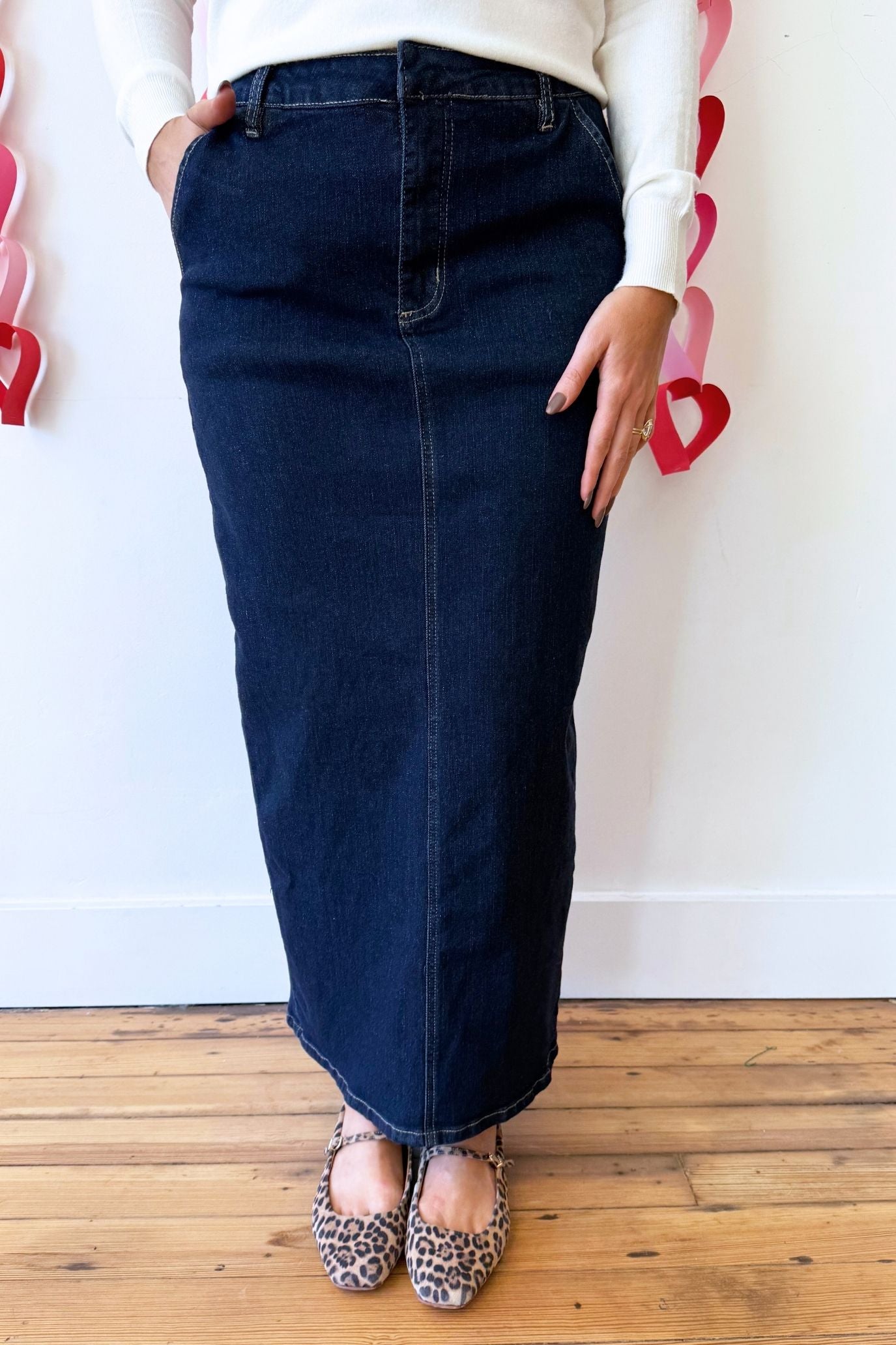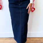 This high-waisted maxi denim skirt offers a timeless, elongated silhouette with a modern touch. The back slit adds just the right amount of movement and edge, making it both comfortable and effortlessly stylish. Dress it up or down for a chic look all year long!