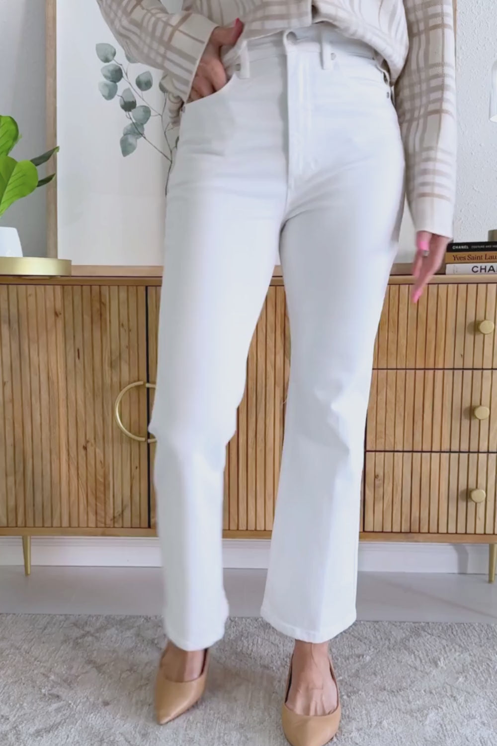 - Crisp white denim for a fresh, versatile look