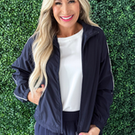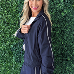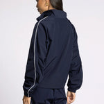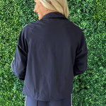 A sporty layer for going to and from workouts or errands, this jacket features a durable nylon fabrication, elasticated cuffs and a high neck with dual side pockets.