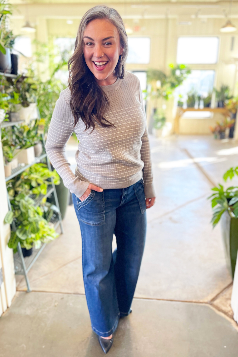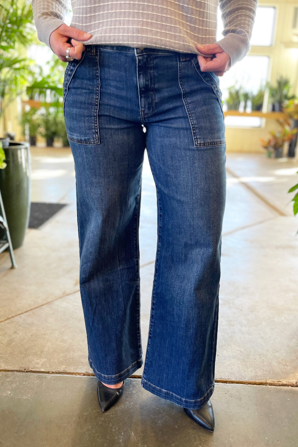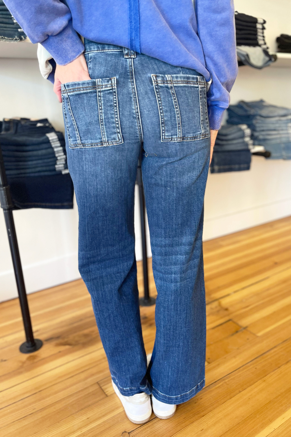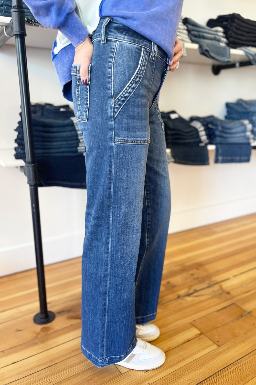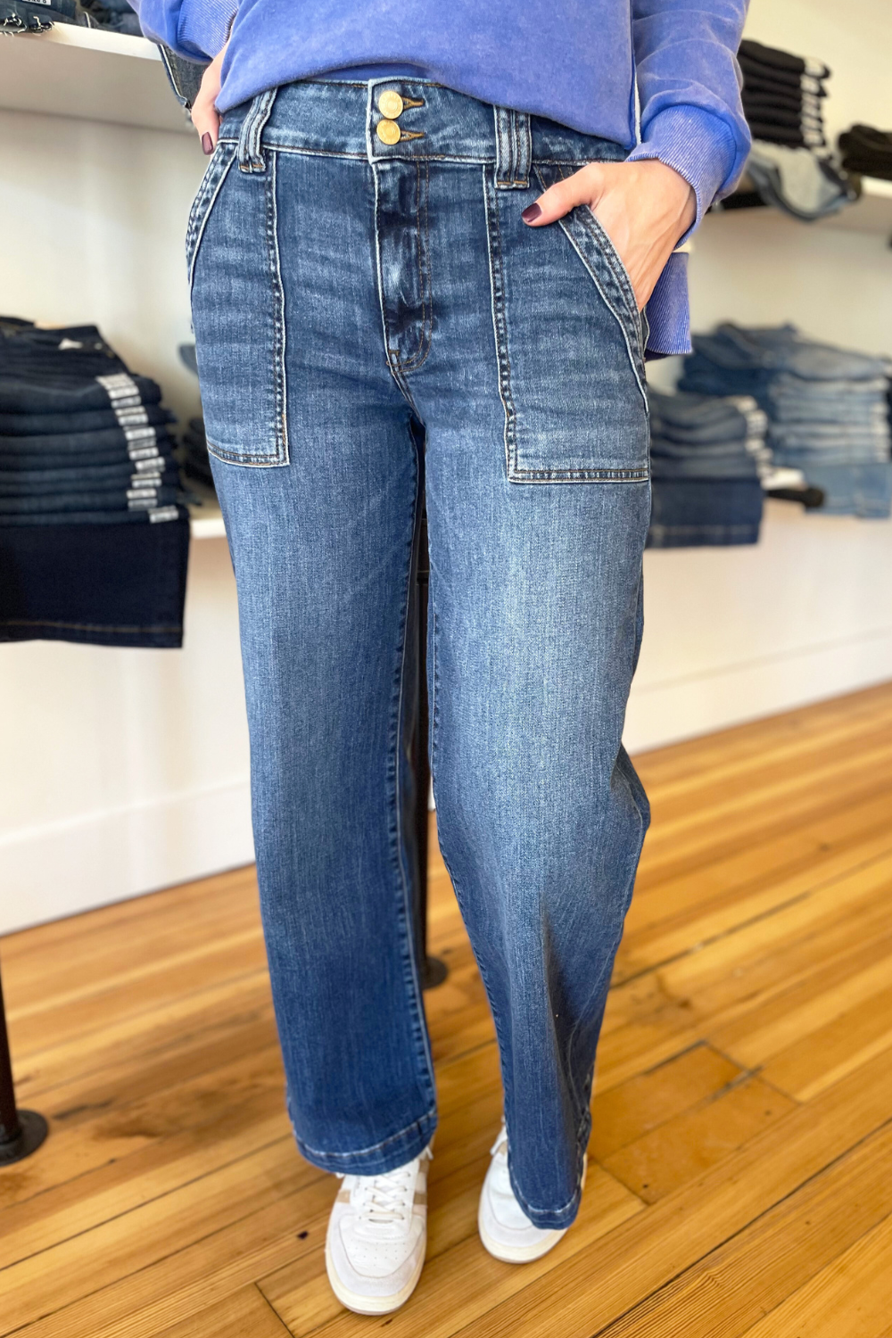 The Jodi High Rise Wide Leg Porkchop Front Pockets denim from Kut is a must-have! The front patch pockets and wide legs give a 70’s vibe to these jeans. They are perfectly faded and have comfy stretch. These denim will take your look to the next level!
