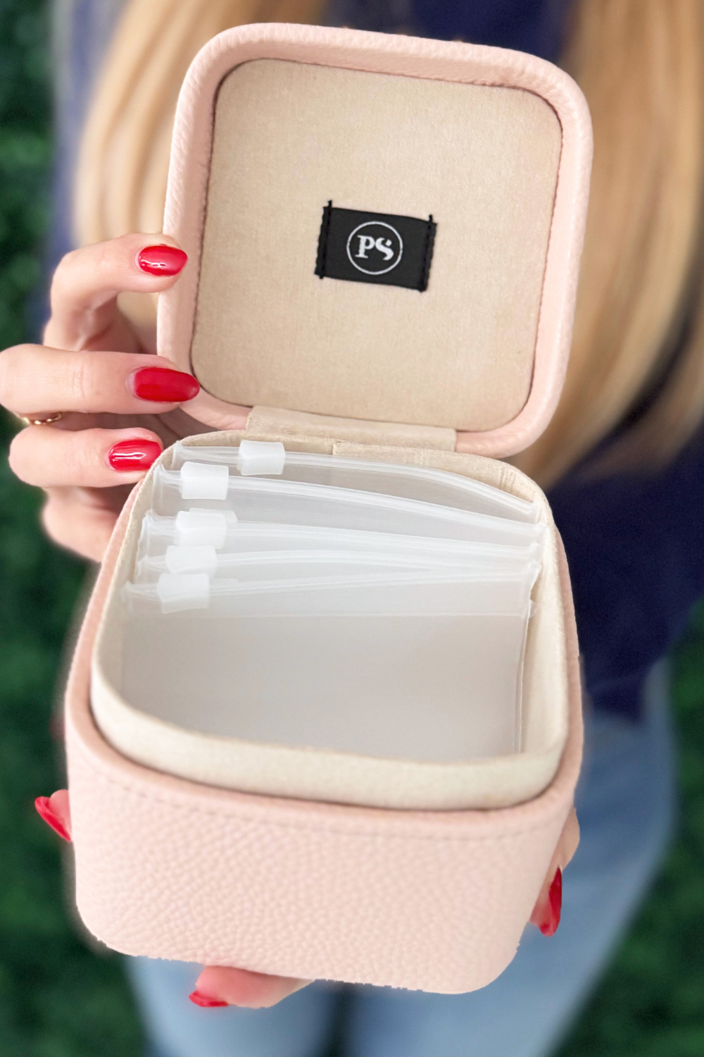Welcome to your travel organizer for jewelry, pills, supplements and more. Our Journey Box holds 14 reusable slide lock pouches that can store your medications, earrings, necklaces, supplements and other small items during travel. Compact, beautiful, brilliant.