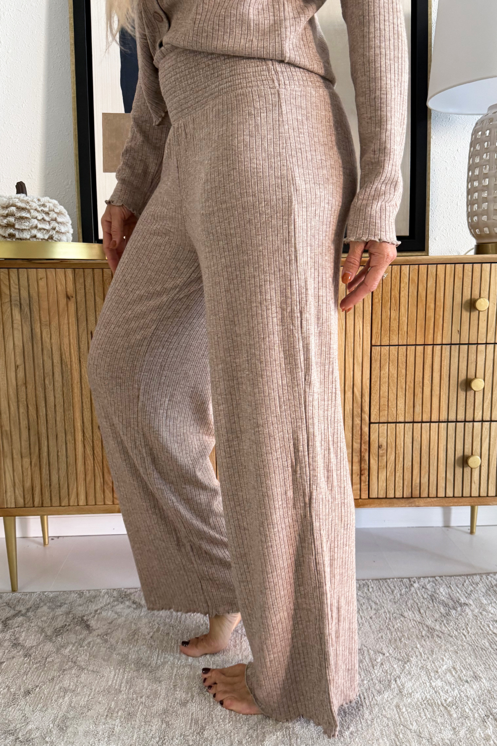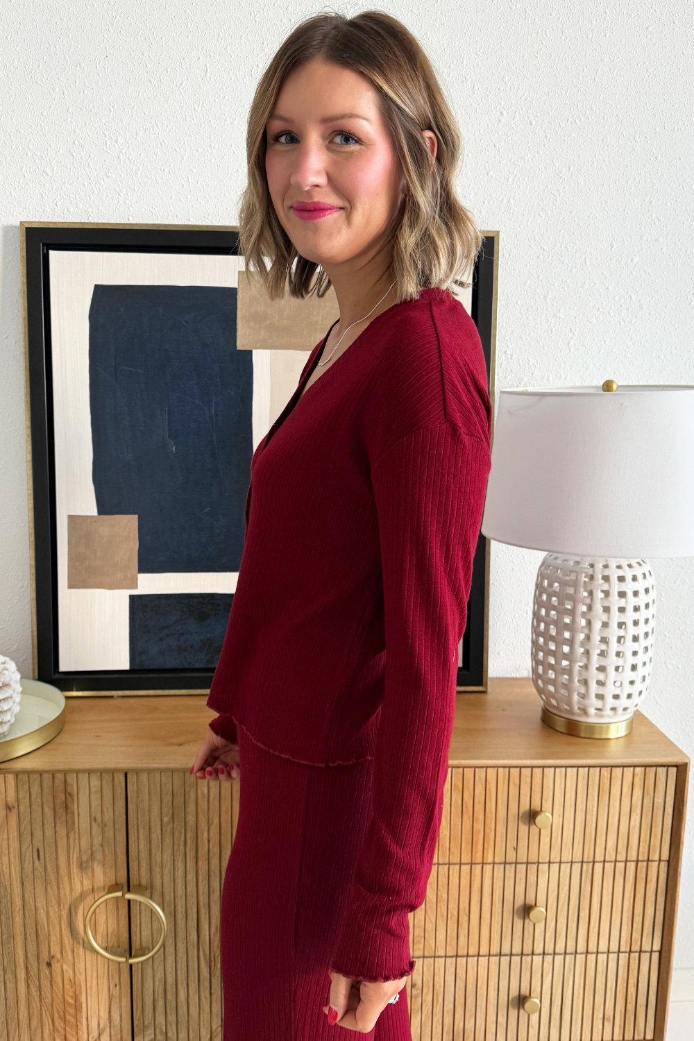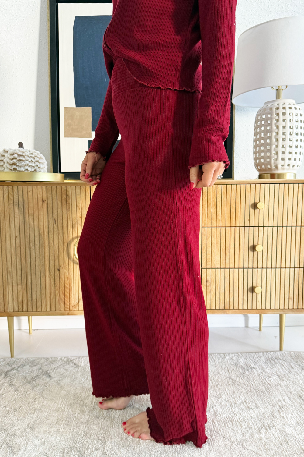 Comfortable and cozy, the Joy Pajama Set will help you cozy up on the couch for a Christmas movie this holiday season! The button up V-Neckline top, ribbed texture fabric, and elastic waistband make for an add to cart no brainer!