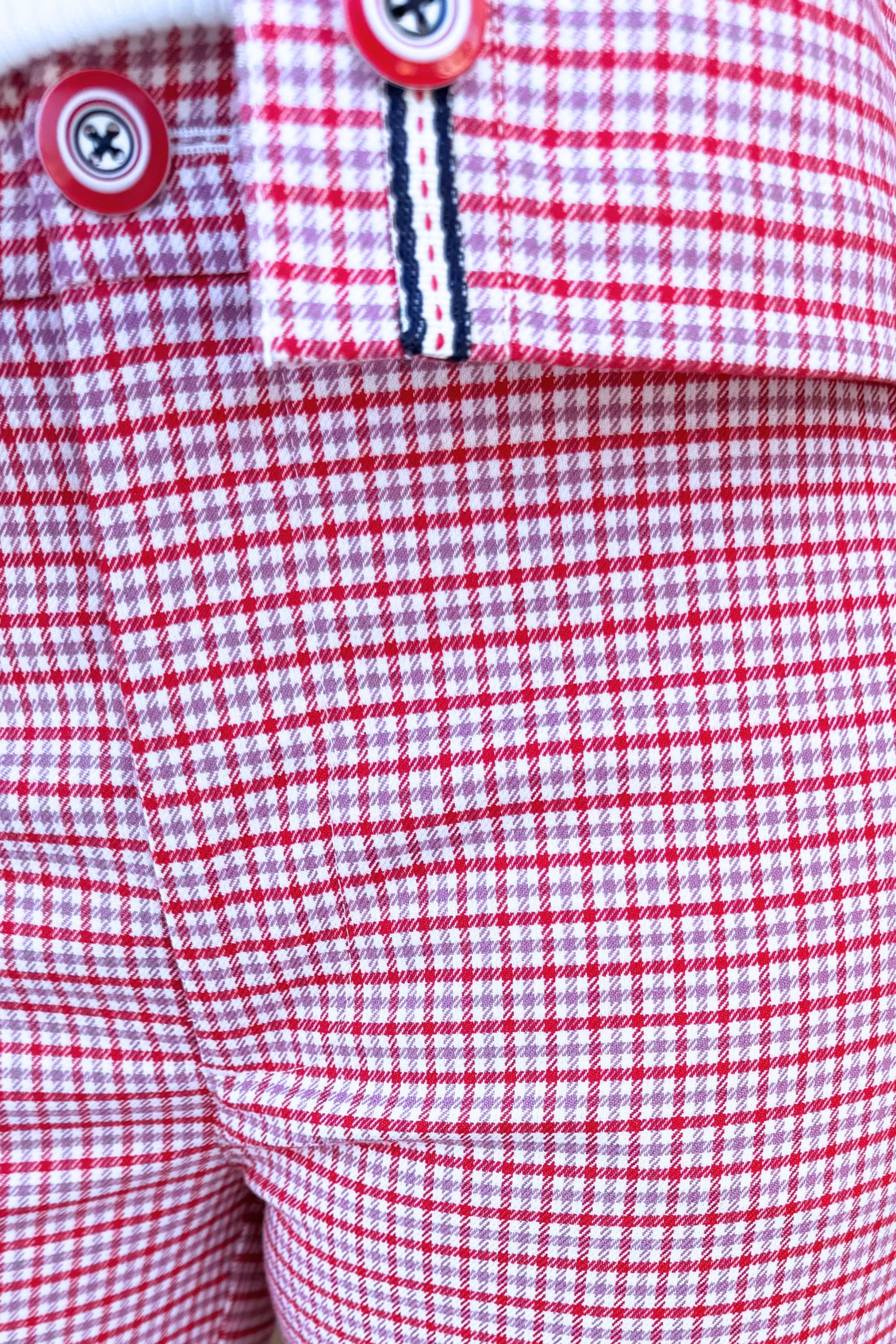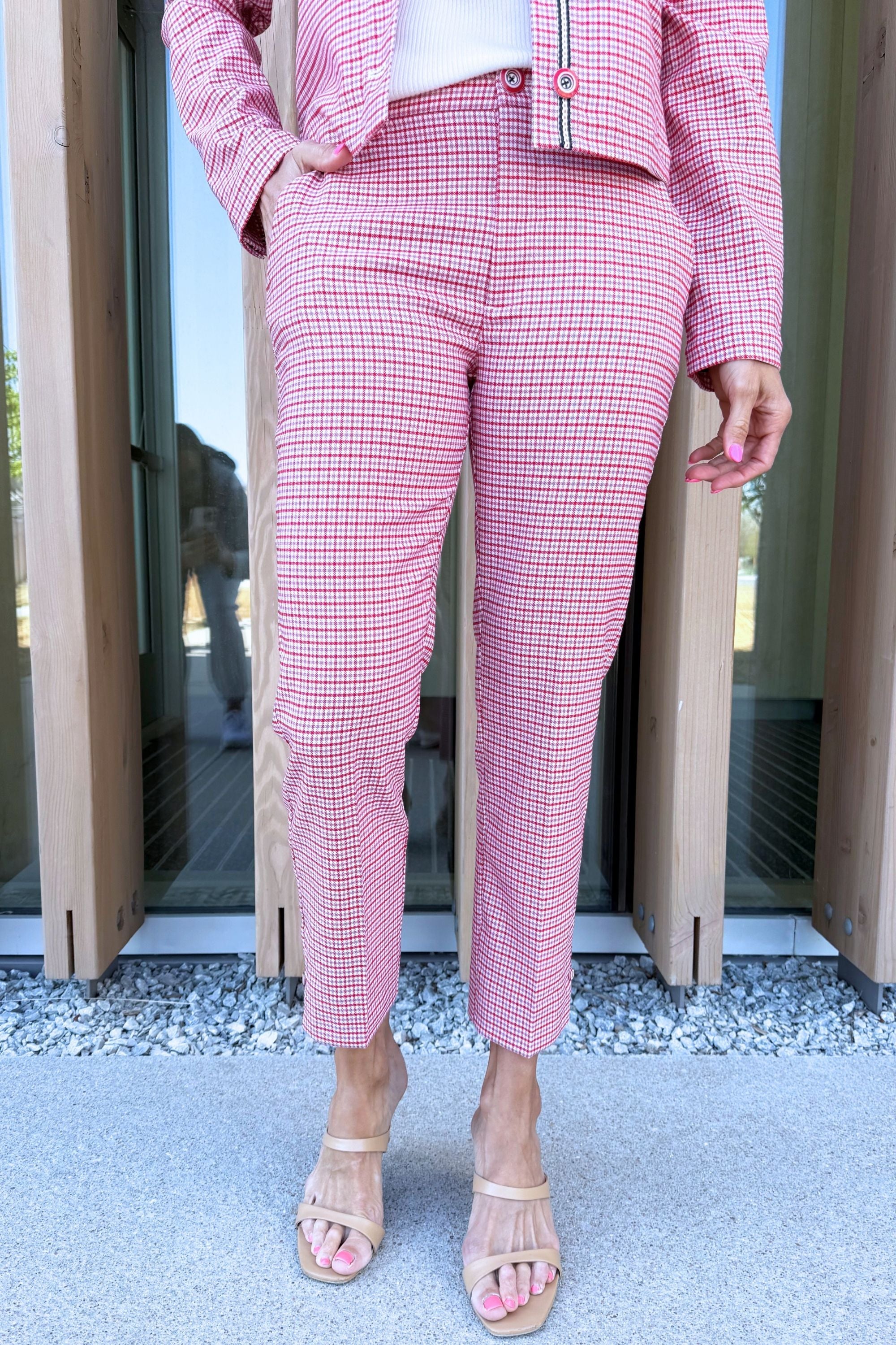 Tailoring, with a point of view. The Kelsey Crop Trouser arrives in cherry red tattersall plaid with a clean mid-rise fit and a subtle side slit for added movement. Finished with a bold red button for just the right contrast. Pair with the matching Shacket with Flap Pockets for a set that feels intentional.
