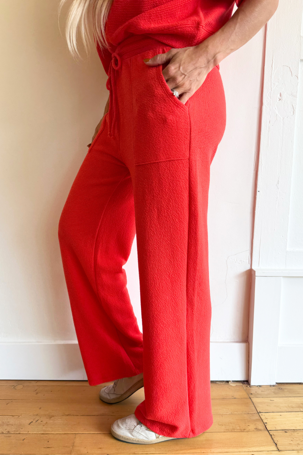 Have the perfect blend of comfort and functionality with these Knit Drawstring Wide Leg Bottoms! Crafted from a soft and breathable knit fabric, these bottoms feature convenient pockets and an adjustable drawstring for a customizable fit. Wear on their own or as a set with the Round Neck Cloudy Knit 1/2 Sleeve Top!
