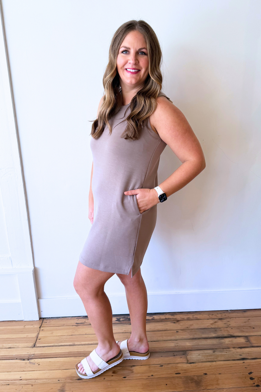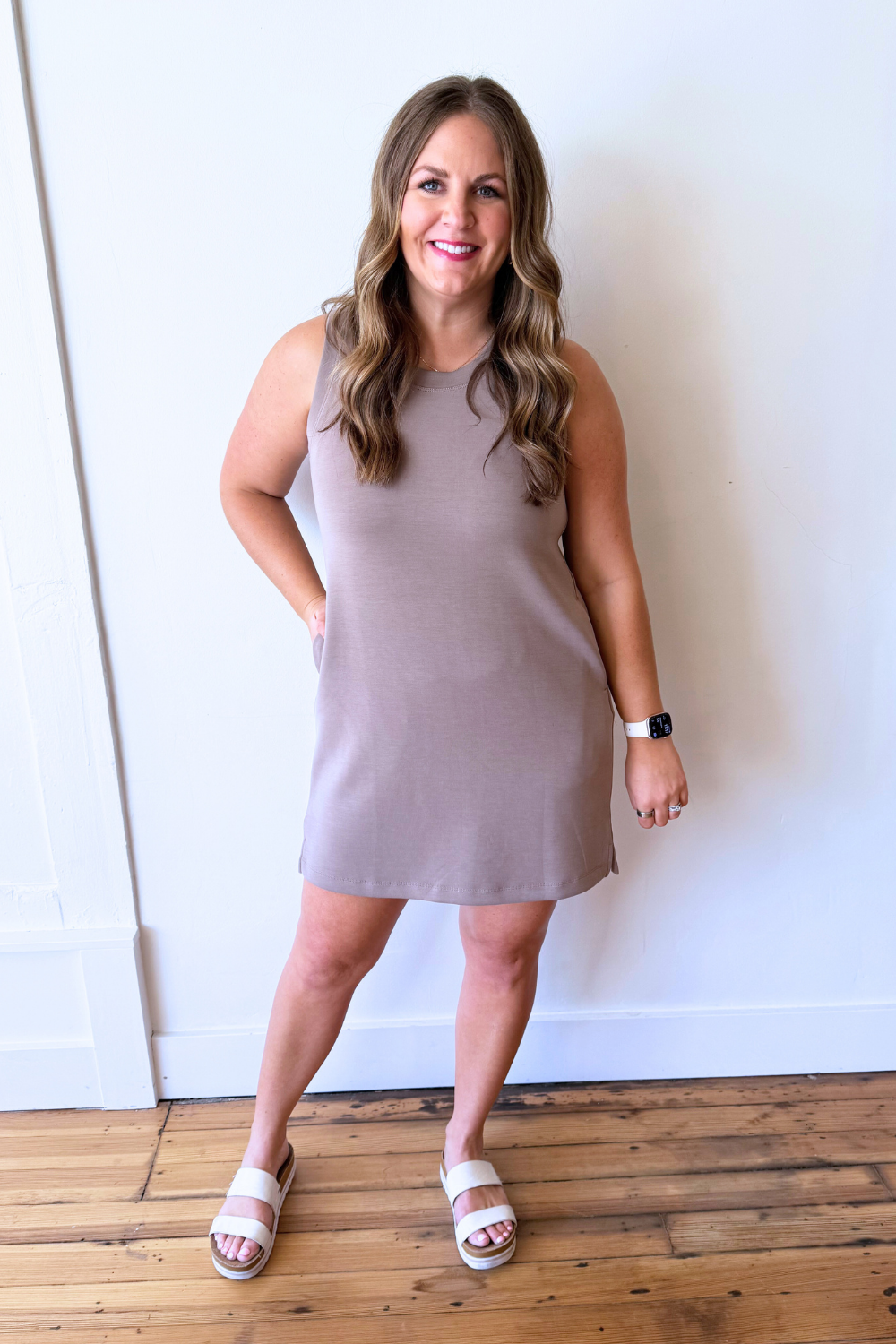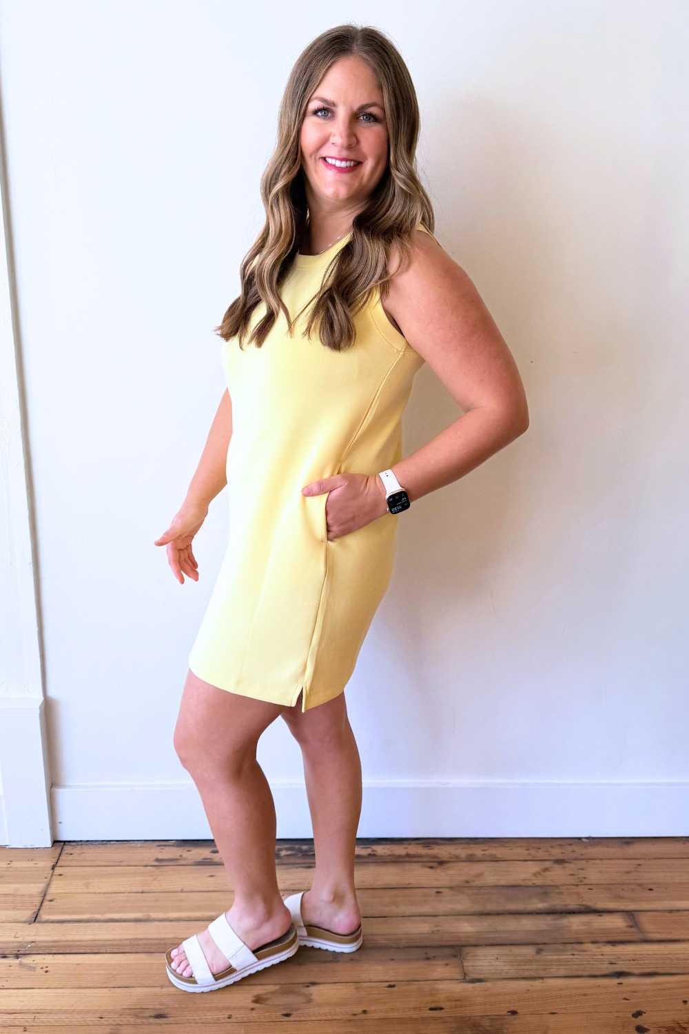 Laguna Scuba Shift Dress Meet your new grab-and-go favorite. This scuba shift dress features a clean, sleeveless silhouette with a relaxed fit that’s flattering and easy to wear. The structured-yet-soft fabric gives it a smooth finish that holds its shape beautifully from day to night.