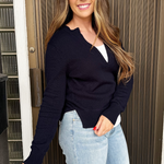 This Layered V-Neck Sweater is a two-tone v-neck knit with a layered hem detail for built-in styling. Pair with denim, joggers, or wide-leg pants for an easy, pulled-together outfit that looks like you tried (even when you didn’t).
