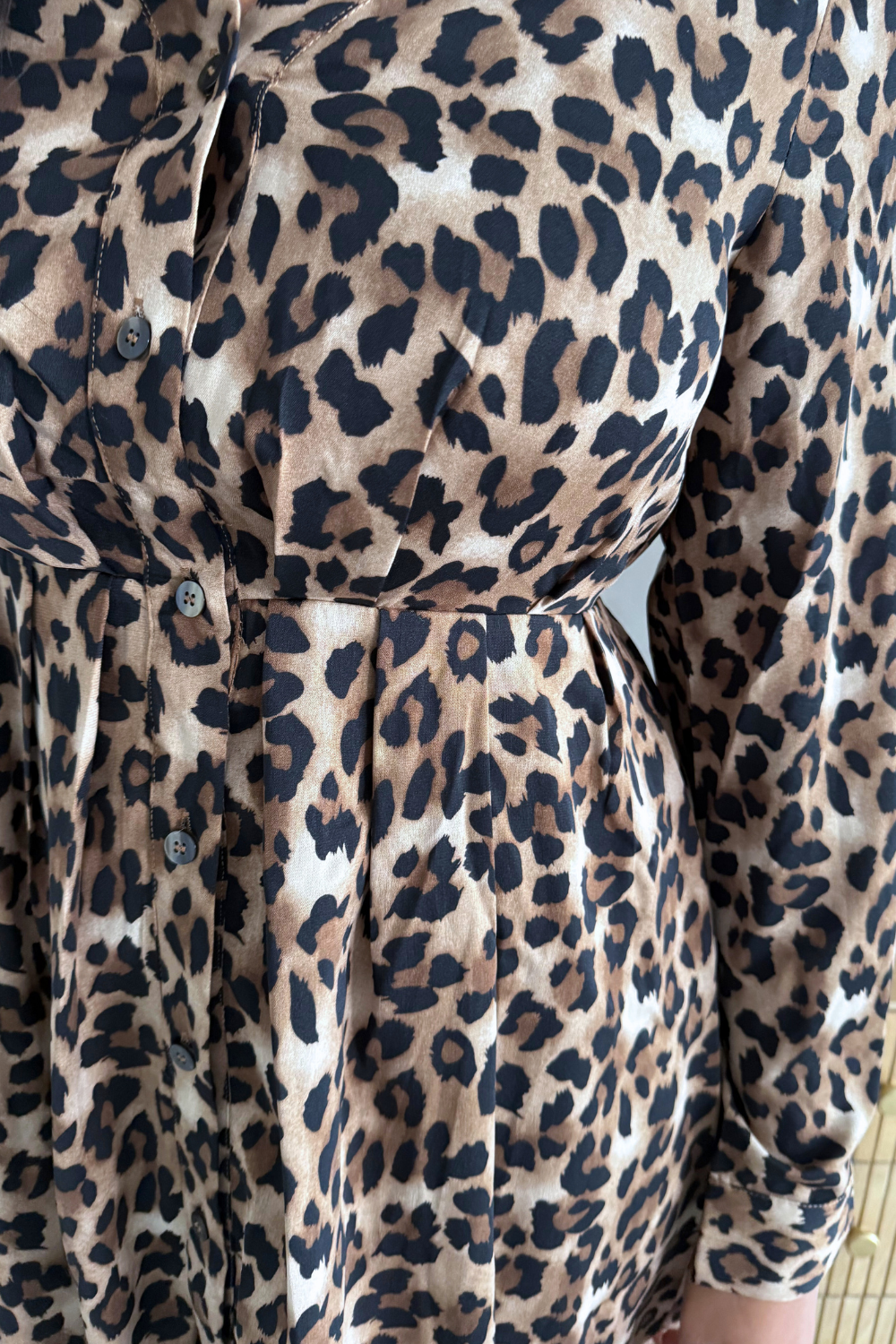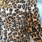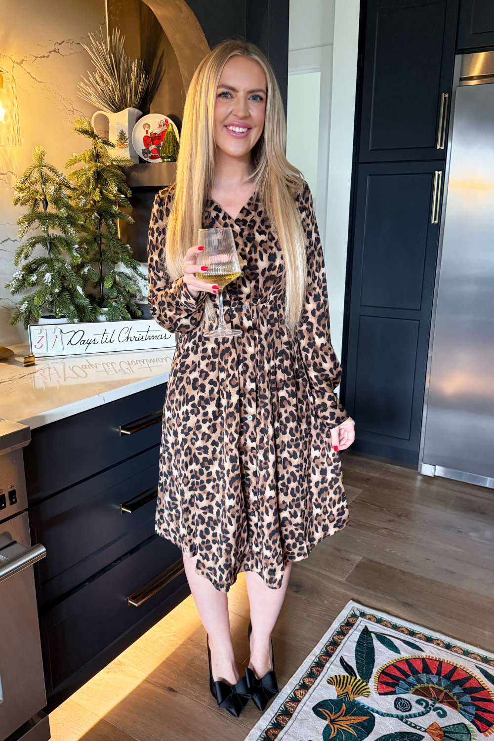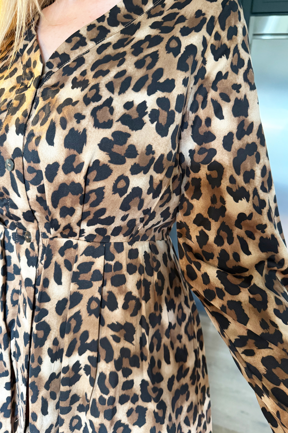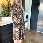 Turn heads in this leopard print button-front midi dress. The long sleeves and flowing silhouette create a chic, flattering shape, while the bold print adds a touch of edge. Perfect for both day and night styling!
