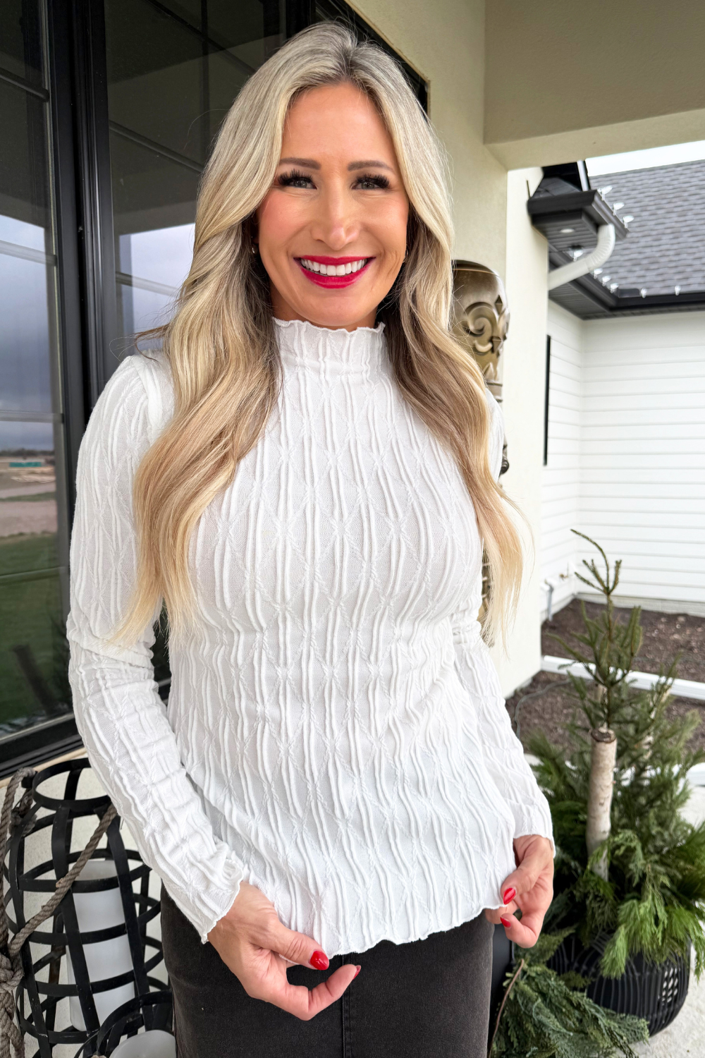 Elevate your everyday style with this delicate textured knit top, featuring charming lettuce-edged hems for a subtle, feminine flair. Soft and lightweight, it’s perfect for layering or wearing on its own for effortless comfort and chic appeal. A versatile addition that pairs beautifully with jeans, skirts, or tailored pants!