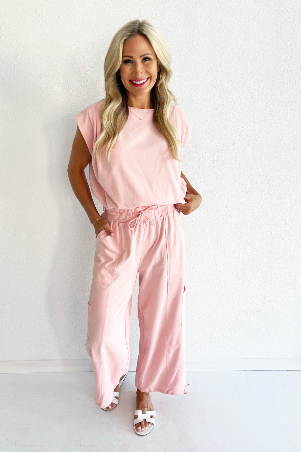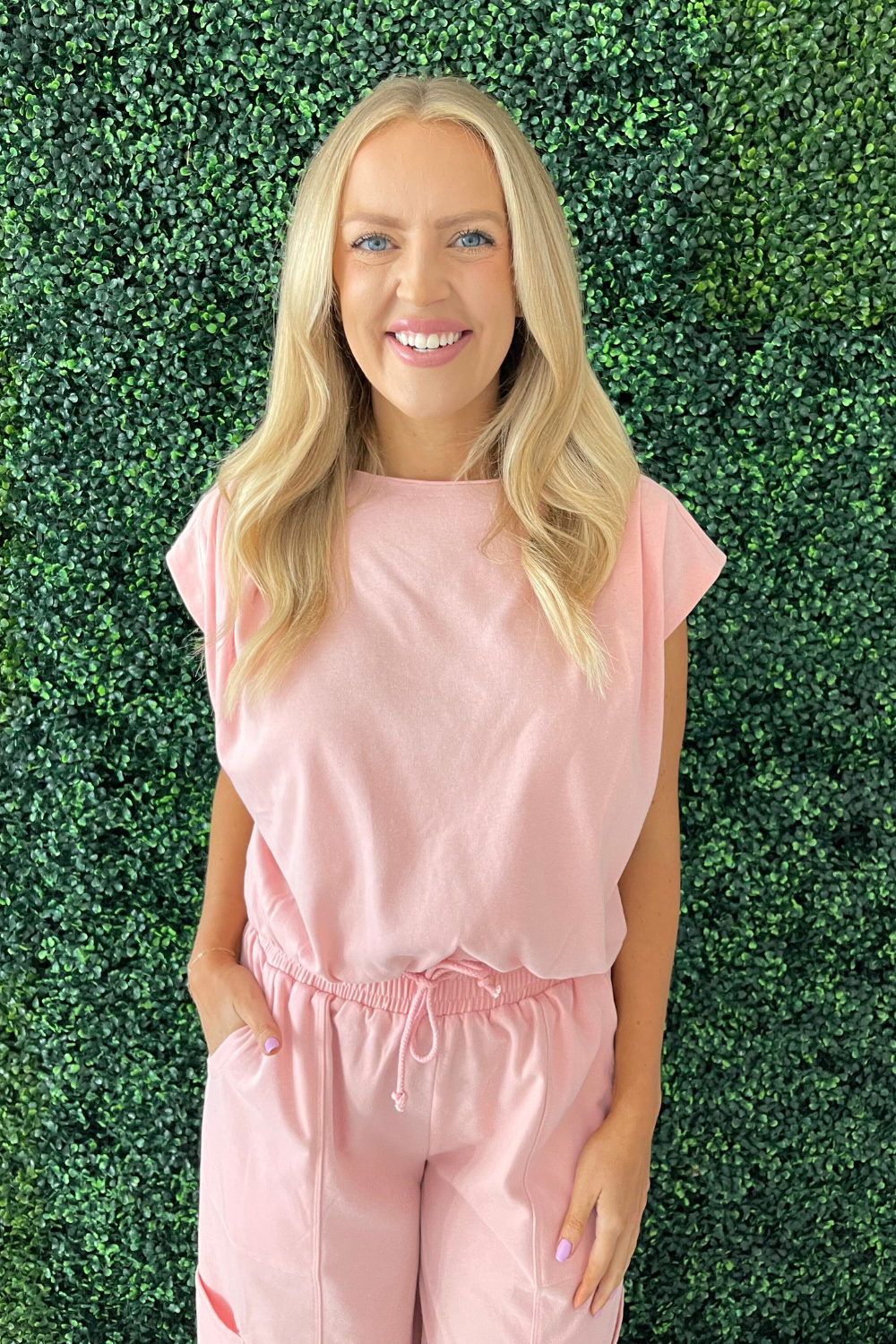 Introducing our Lightweight Knit Top in the softest shade of baby pink. With delicate shoulder pleated details for a touch of elegance, this top is perfect for staying cool and stylish on warm days. Wear this top with the Baggy Cargo Lounge Pants for a matching set.