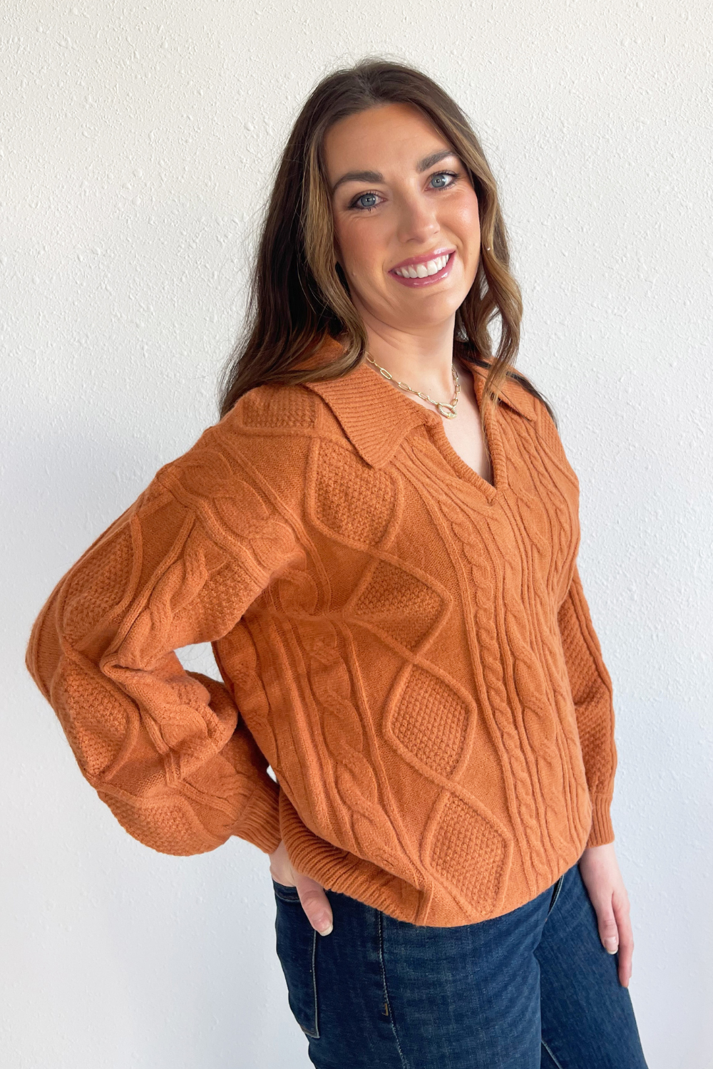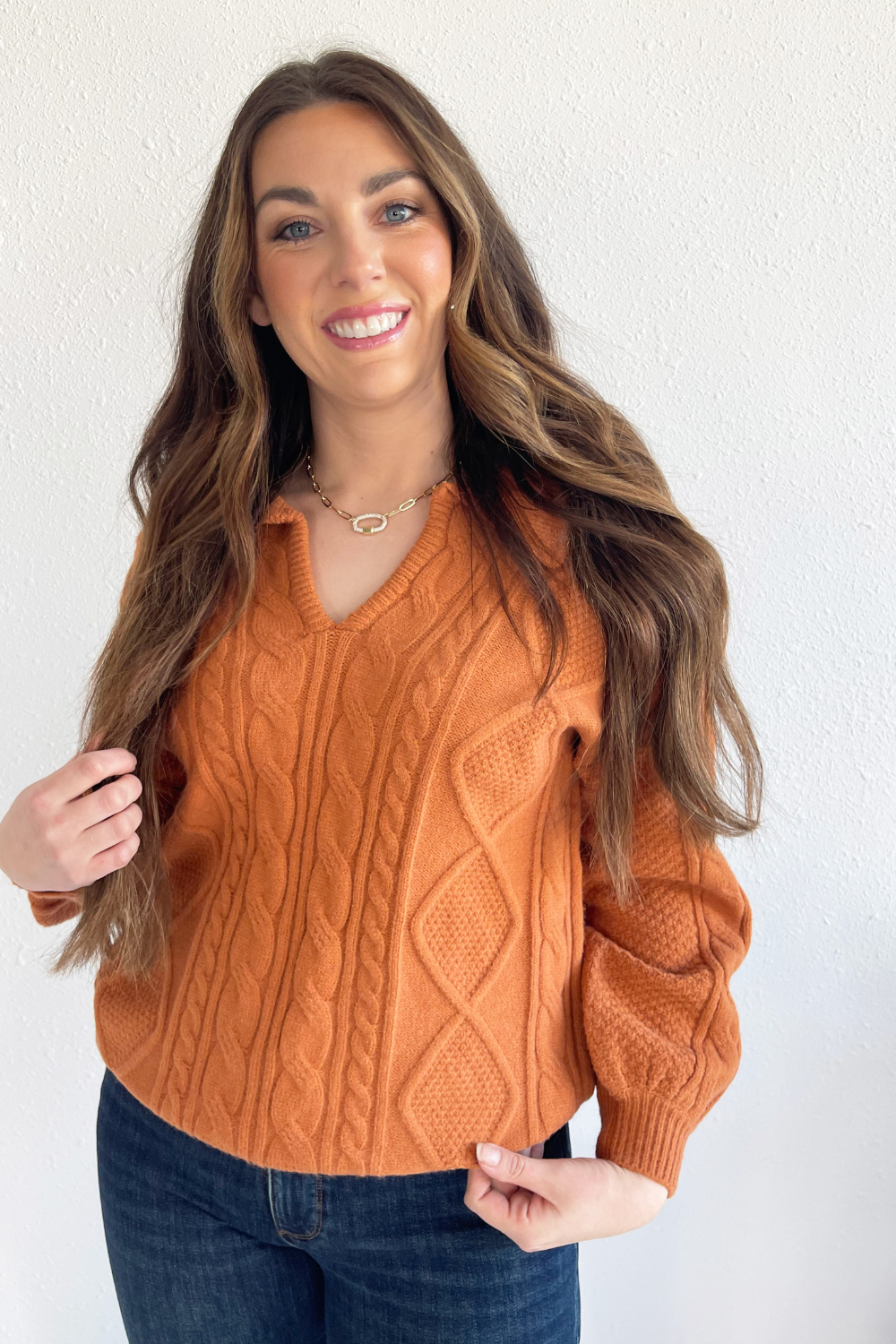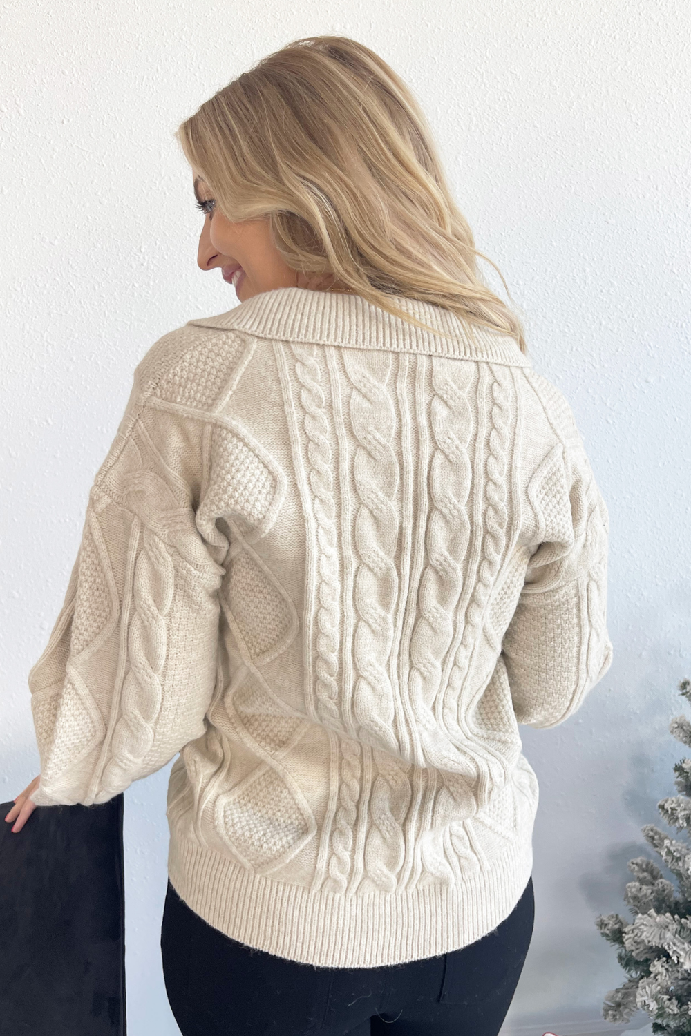 Stay cozy and chic in the Long Sleeve Collar Cable Knit Sweater. With its classic cable knit design and collar, this sweater is perfect for cooler days. This sweater will keep you warm and stylish. Pair it with denim or trousers.