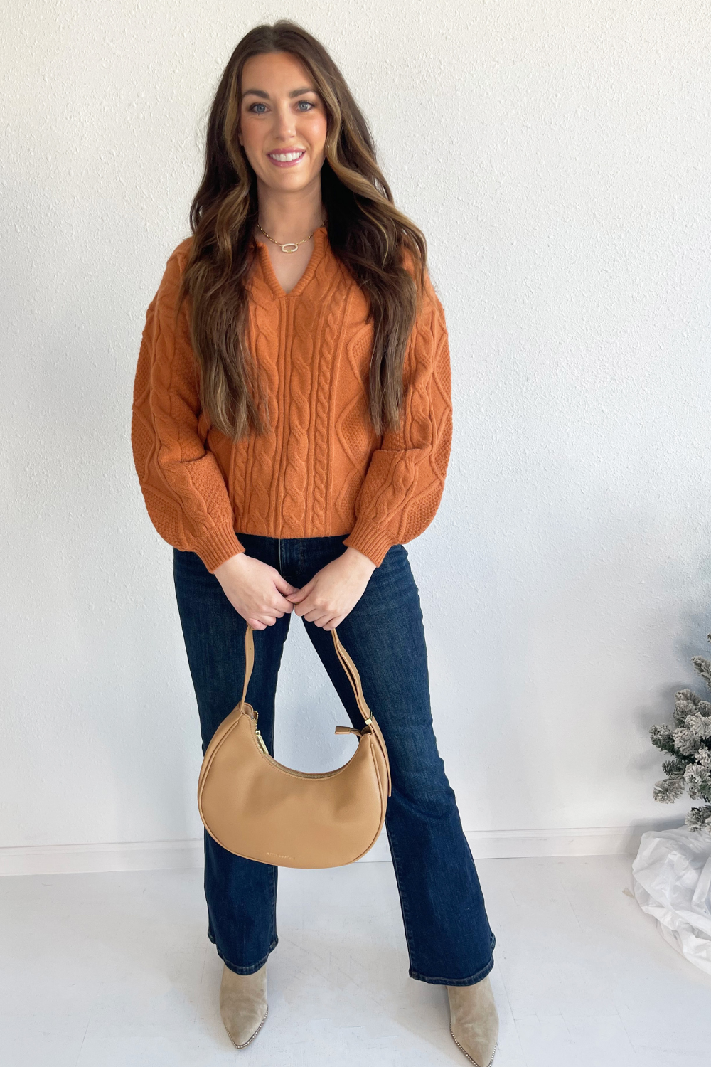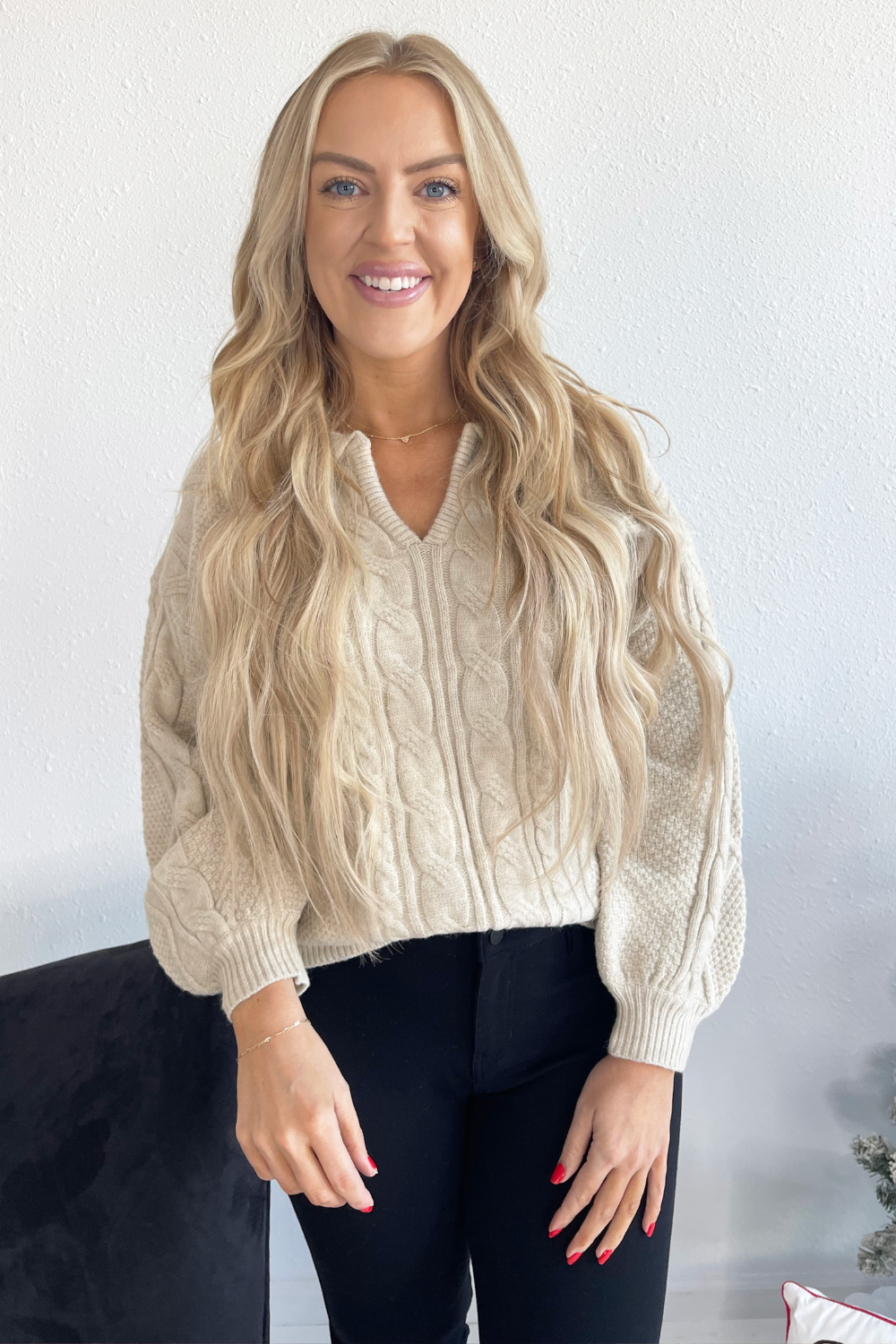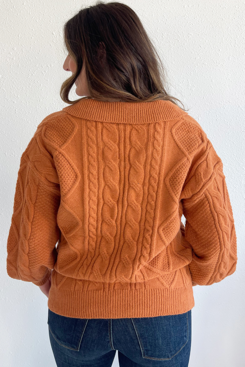 Stay cozy and chic in the Long Sleeve Collar Cable Knit Sweater. With its classic cable knit design and collar, this sweater is perfect for cooler days. This sweater will keep you warm and stylish. Pair it with denim or trousers.