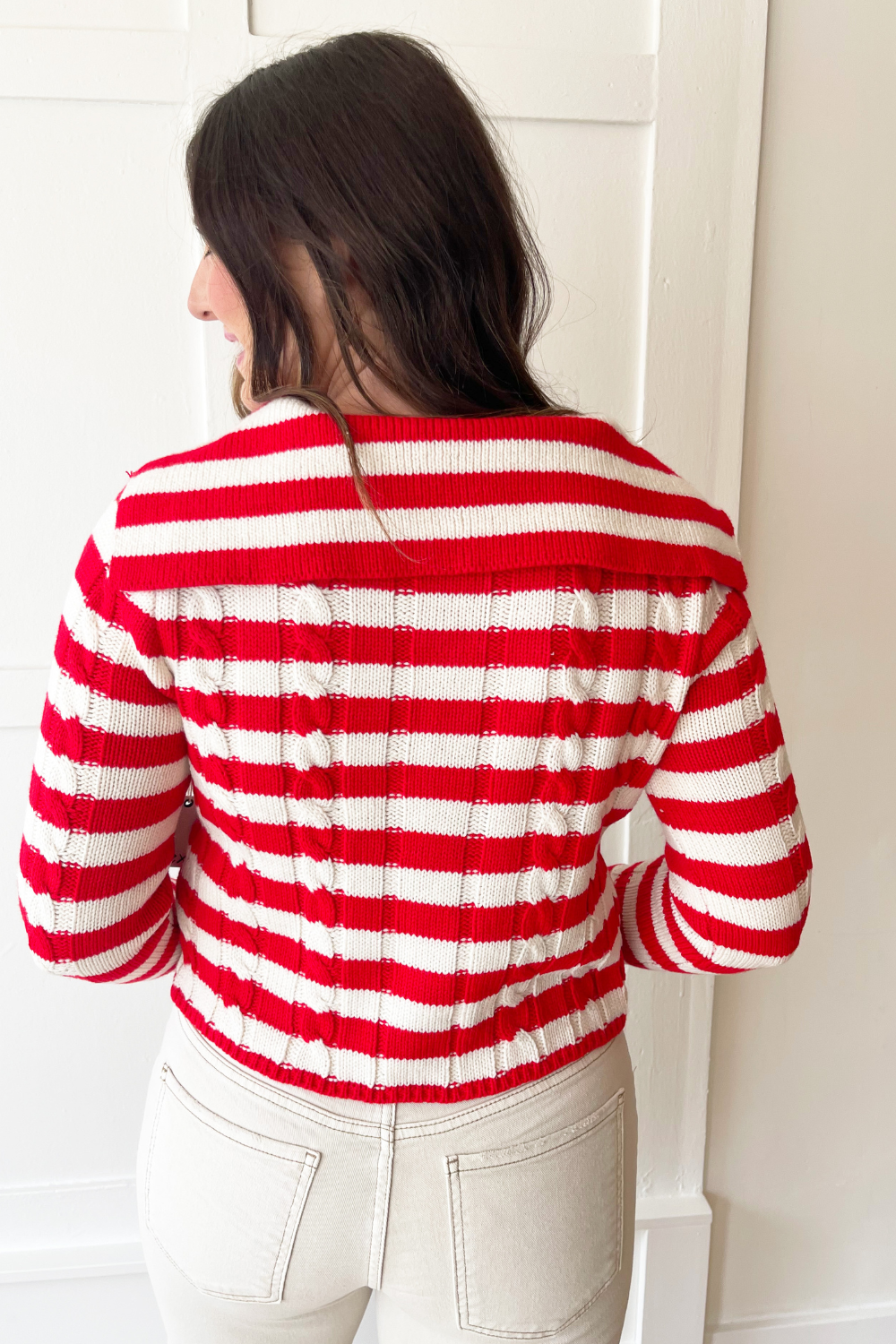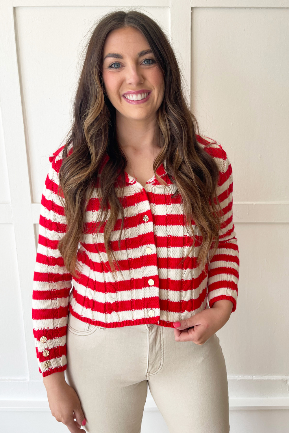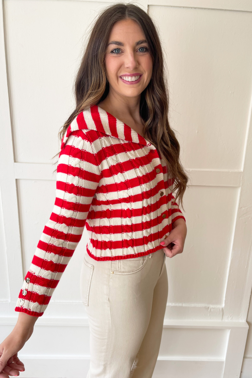 The Long Sleeve Knit Stripe Cardigan is perfect for warmer weather. This long sleeve sweater has an open collar V neck and button front. The cable knit design and striped pattern add a playful touch to this sweater. Wear it with denim or shorts for a fun casual outfit.