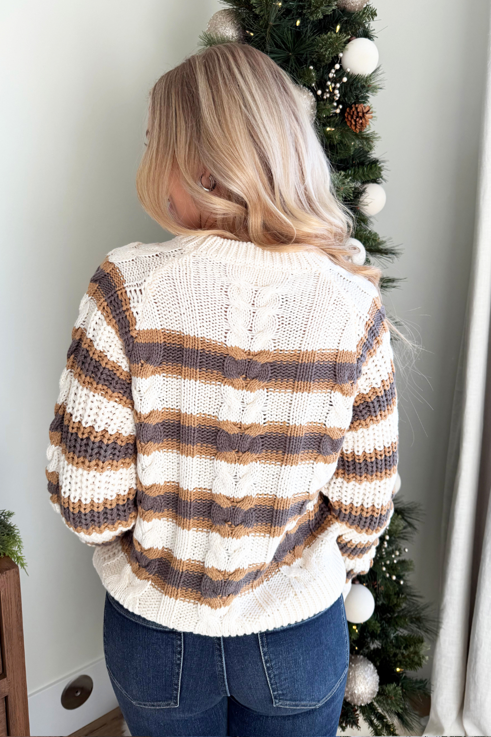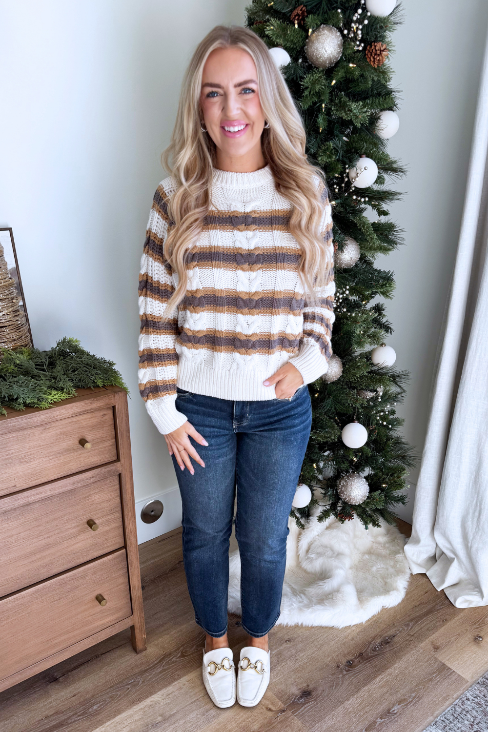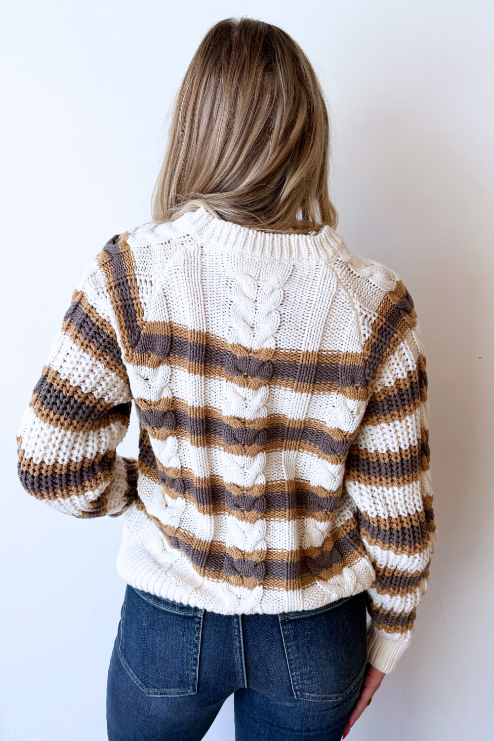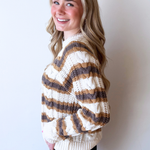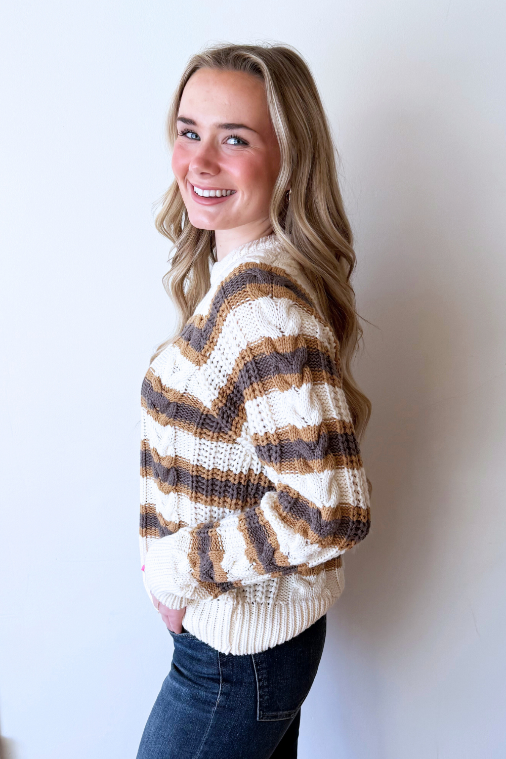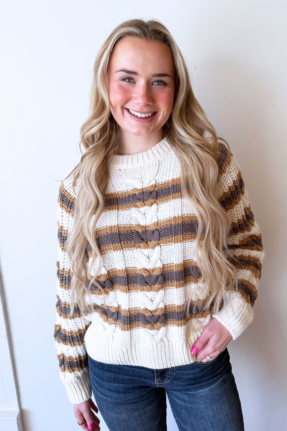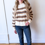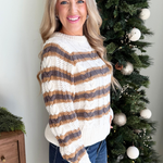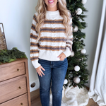 This long sleeve knitted striped sweater is a timeless staple with effortless appeal. Featuring a soft knit feel and classic stripe pattern, it offers cozy comfort and easy everyday style. Perfect for layering or wearing on its own all season long!
