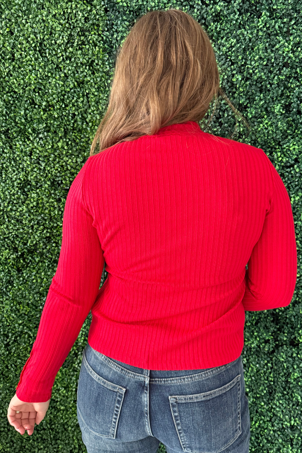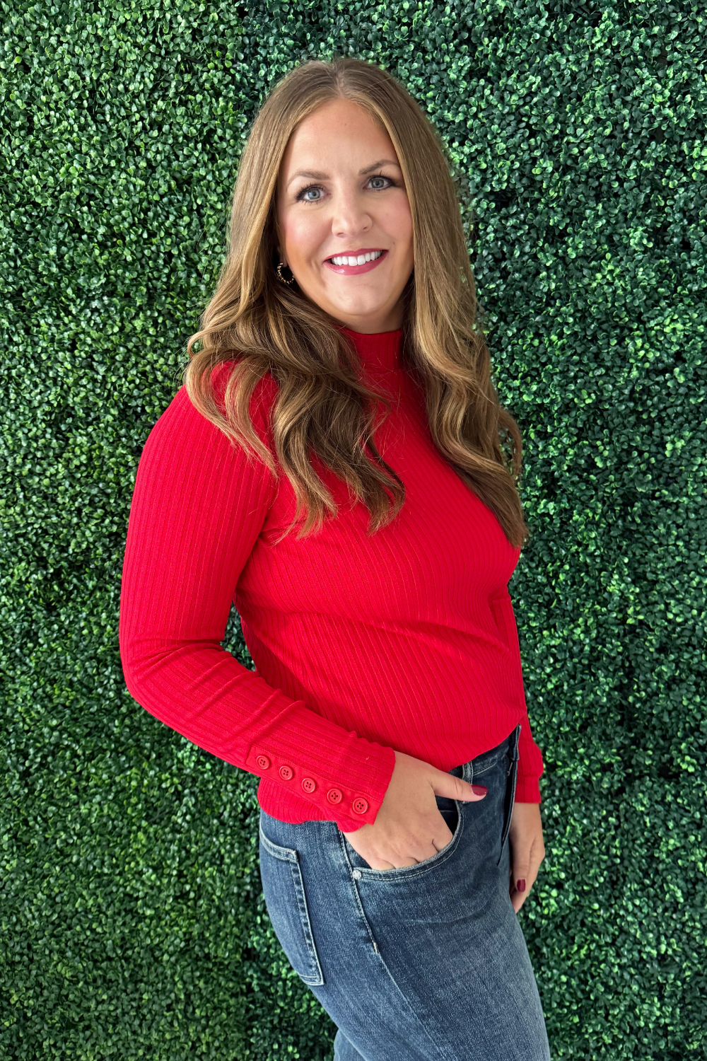 An everyday go to, made better! This rib-knit mock neck top delivers ease with long sleeves, a straight hem, and subtle button details at the cuff. Soft and easy to wear, it's a versatile staple that moves seamlessly between seasons!