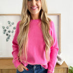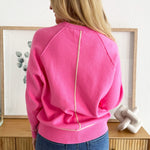 This vibrant knit pullover features a relaxed, slightly cropped silhouette with raglan sleeves, ribbed trim at the crew neckline, cuffs, and hem, and contrast piping along the seams and edges for a bold, sporty chic finish!