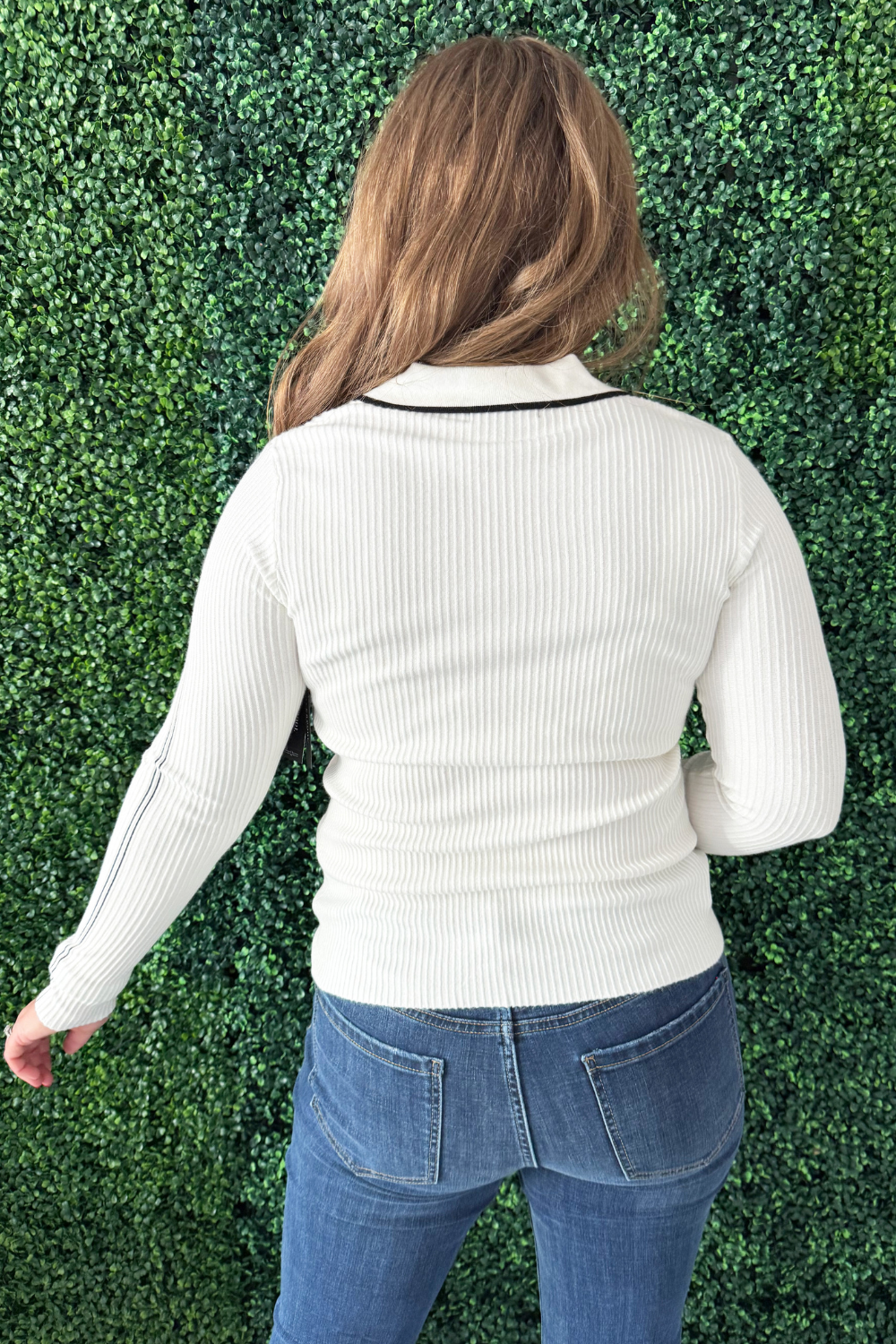 This long sleeve V-neck sweater is accented with vintage inspired striping donw the side and sleeve, and a tipped collar that sharpens the look. The clean neckline and tailored drape make it easy to pair with denim, trousers, or layer under outerwear, adding effortless polish with just the right edge.