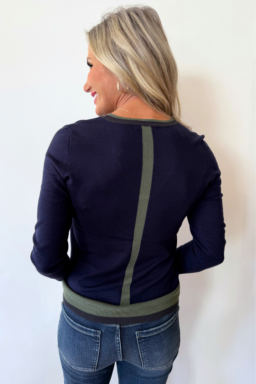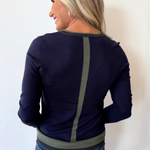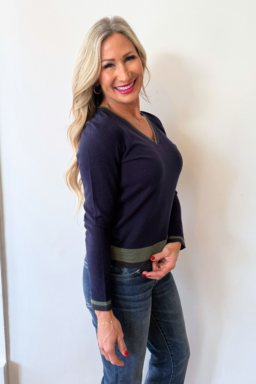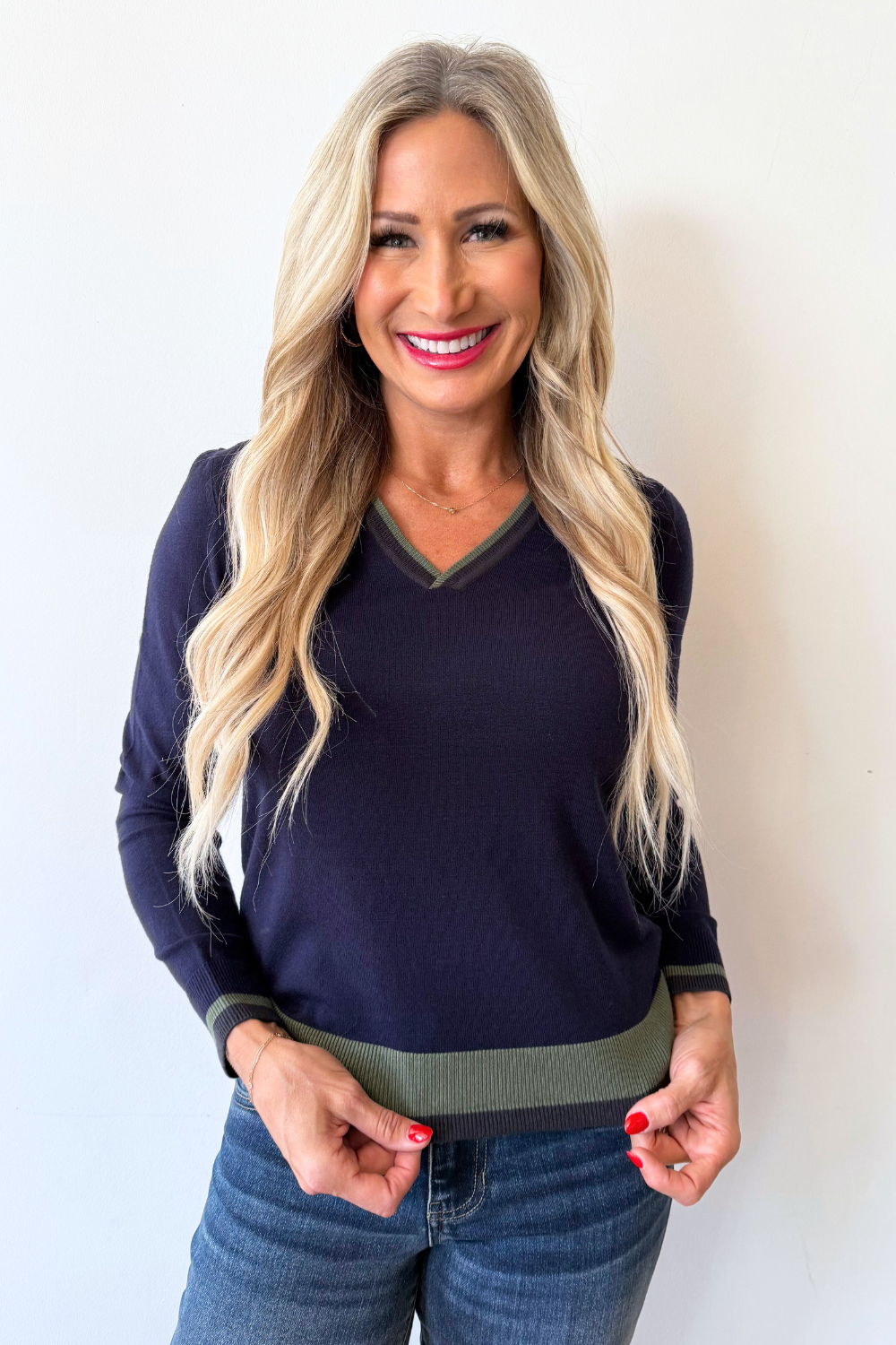 The Long Sleeve V-Neck Colorblock Sweater from Liverpool is as soft as it is cozy. The sweater features eye-catching color block details on the sleeves, neckline, back, and bottom hem. It has a contemporary flair and a timeless silhouette. The sweater pairs perfectly with denim or trousers.