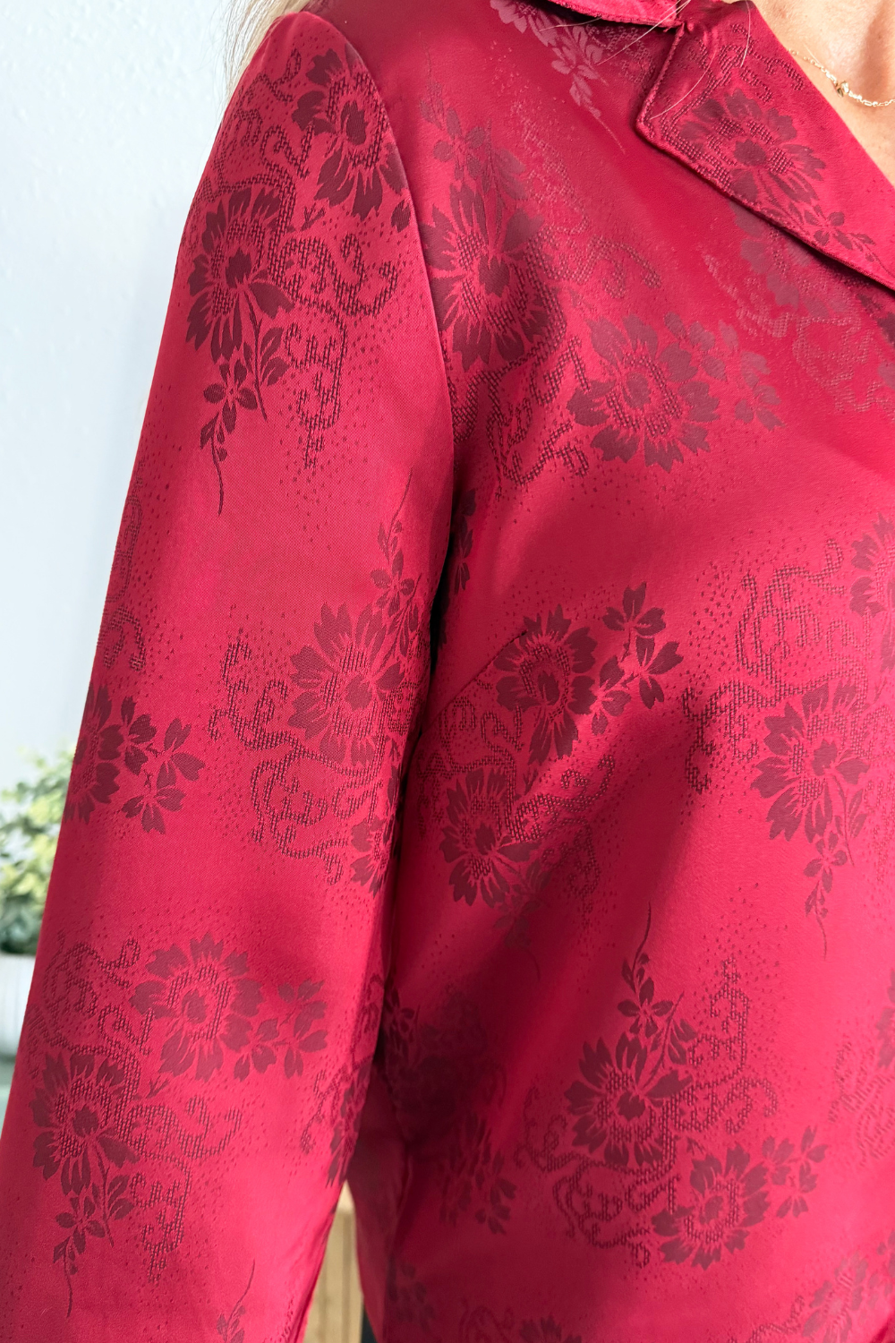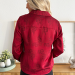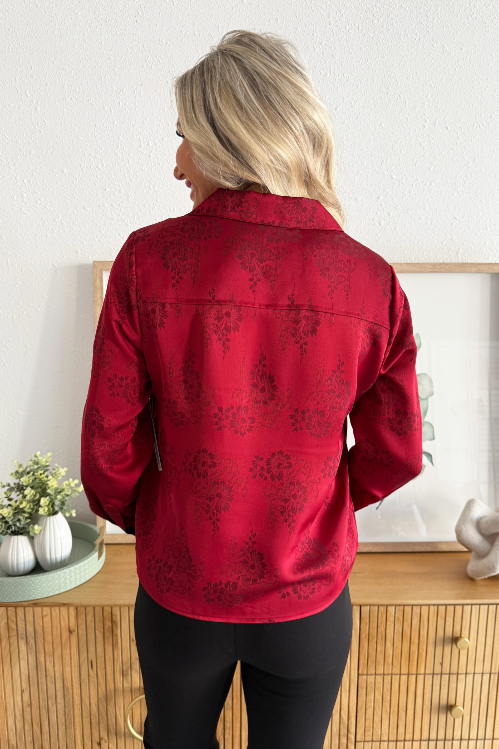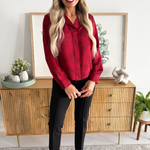 This Long Sleeve Woven Top in dark red floral brings subtle texture and depth to a timeless silhouette. Designed with a crisp collar, hidden button placket, and cuffed sleeves, it delivers effortless polish with a touch of feminine detail.