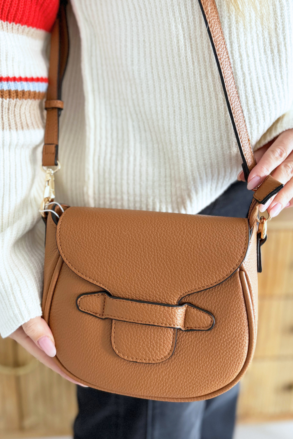 The Mable Flapover Crossbody Bag offers a sleek saddle silhouette with secure closures and a versatile strap for easy wear.