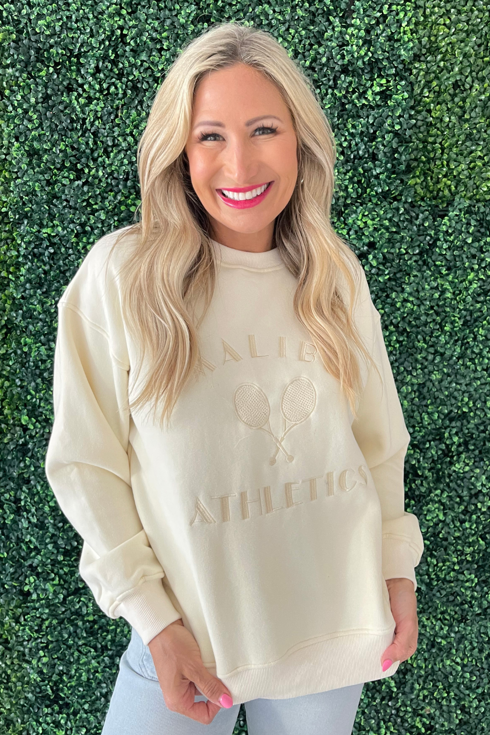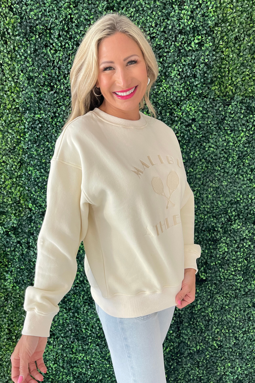 The Malibu Athletics Pullover is an easy to wear sweatshirt. This long sleeve sweatshirt has a crew neck, relaxed fit, and embroidered Malibu Athletics design. It is super soft and the perfect weight – not too heavy, not too light. Wear it with denim or shorts for an easy casual look.