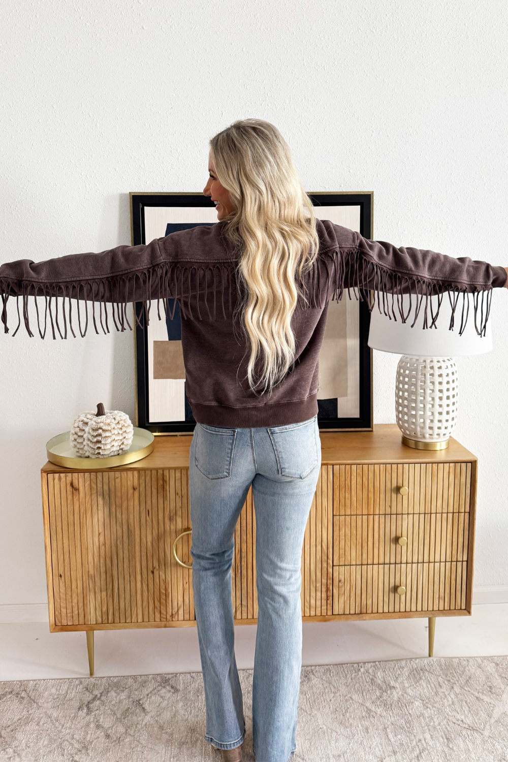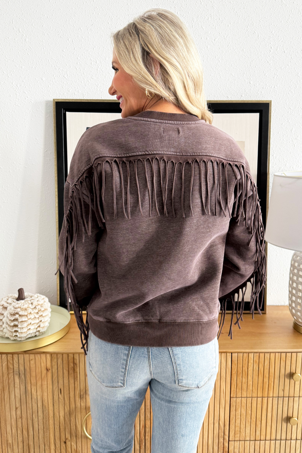 A classic twist of fringe, this fun pullover is featured in a garment dye for that lived in look with fringe detailing throughout! Throw on with denim and heels for a look that will take you from day to night!