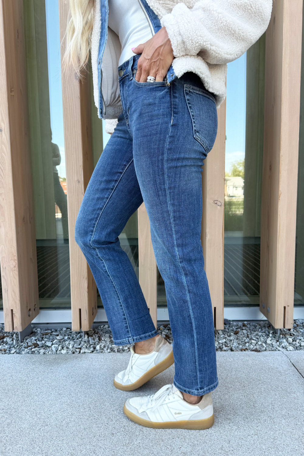 The Marley Girlfriend Cuffed 30in 27in ins denim is Liverpool’s signature girlfriend jean with a beautiful silhouette. These jeans have a mid-rise, classic 5 pocket styling, and a zip fly and button closure. These jeans are slimmer than a boyfriend, and give you the perfect amount of leg room. Wear them cuffed or uncuffed for two different looks.
